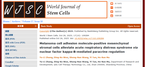 近日,山东省齐鲁细胞治疗工程技术有限公司(以下简称“齐鲁细胞”)研发团队在国际权威期刊《World Journal of Stem Cells》在线刊发重要研究,揭开了CD146+间充质干细胞(MSCs)治疗急性呼吸窘迫综合征(ARDS)的关键机制!张亚丽担任第一作者,马贺然博士、谭毅博士为共同通讯作者。