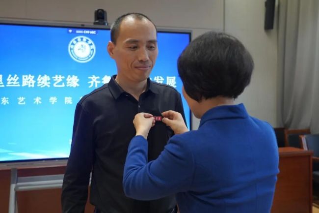会后,党委书记徐梅为山艺新疆校友佩戴校徽。