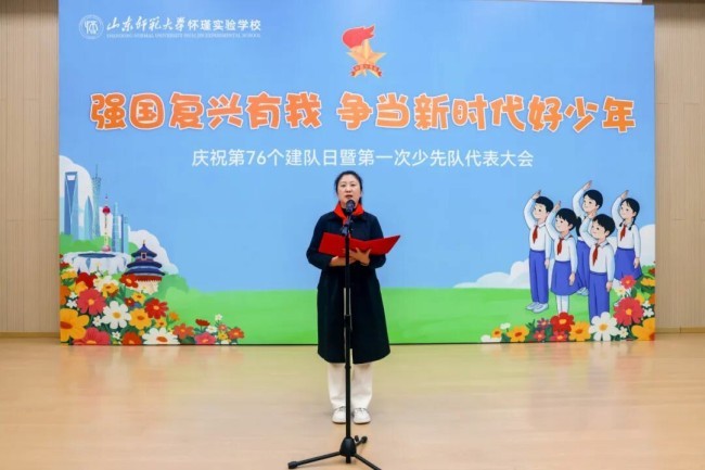 校长辛吉荣发表总结讲话。他指出,此次少代会不仅是一场仪式,更是生动的成长课,“安全副校长”“校外辅导员”受聘、新建中队授旗、首届大队委员宣誓等,都是具有里程碑意义的时刻。他强调,山东师范大学怀瑾实验学校始终以“为未来育人,育未来之人”为使命,将少先队工作作为立德树人的重要抓手,未来会持续夯实组织根基,让星星火炬在校园的每一处闪耀。
