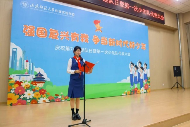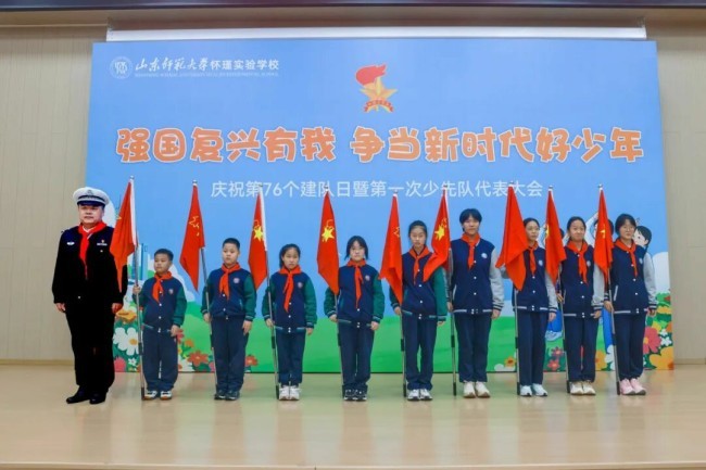 星星火炬引航程,红领巾飘扬映初心。10月12日下午,山东师范大学怀瑾实验学校校园里红旗招展、队歌嘹亮,隆重举行庆祝第76个建队日暨第一次少先队代表大会。