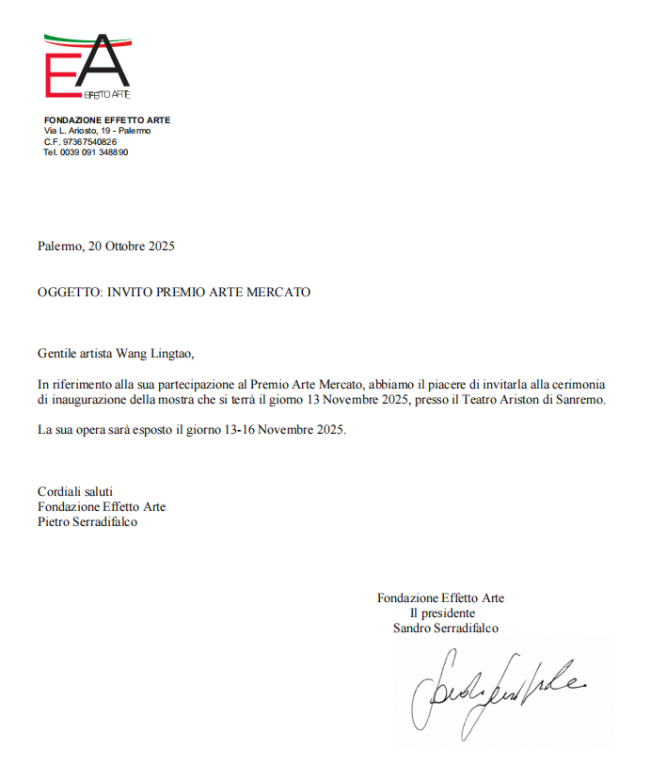 意大利埃菲托艺术基金会在邀请函中特别提及,将为“力明双玺杯”系列之蓬承莲礼套装参展提供多维度的重点支持,以凸显对作品的高度重视:11月13日展览开幕式当天,双玺杯将作为重点展示内容,在圣雷莫阿里斯顿剧院主舞台巨幕专属呈现,同步触达现场嘉宾与全球直播观众;此外,《Effetto Arte》杂志第9期将为作品预留核心版面,埃菲托艺术基金会主席桑德罗·塞拉迪法尔科将亲撰评论文章,从艺术价值与文化意义层面,为“力明双玺杯”系列之蓬承莲礼套装提供国际权威的学术解读与专业认可。