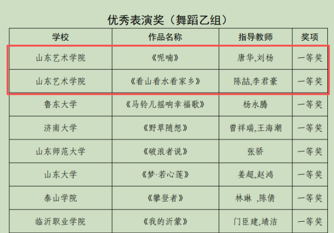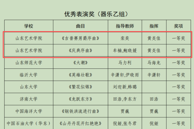 山东艺术学院音乐学院作品《吉普赛男爵序曲》和《庆典序曲》分别获得优秀表演奖(器乐乙组)一等第一、二名,舞蹈学院作品《呢喃》《看山看水看家乡》分别获得优秀表演奖(舞蹈乙组)一等奖第一、二名。音乐学院教师栾奕、牟楠、鲍晓媛,舞蹈学院教师唐华、刘杨、陈喆获指导教师奖,山东艺术学院获优秀组织奖,实现了所设奖项的获奖全覆盖。