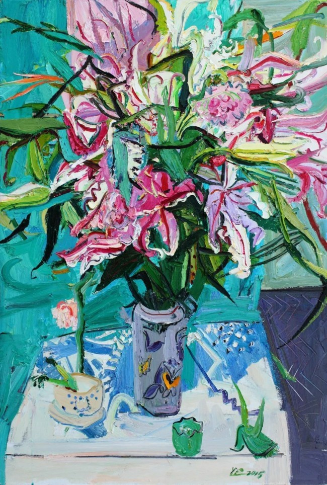 作品中的百合花元素,是闫平钟爱的创作素材之一。百合花优雅的形态、修长的花蕊都散发着独特的美感,而其蕴含的美好寓意,更是使其成为了跨越时间与空间限制的经典象征,无论在何时何地出现,都能给人带来一种宁静与祥和之感。