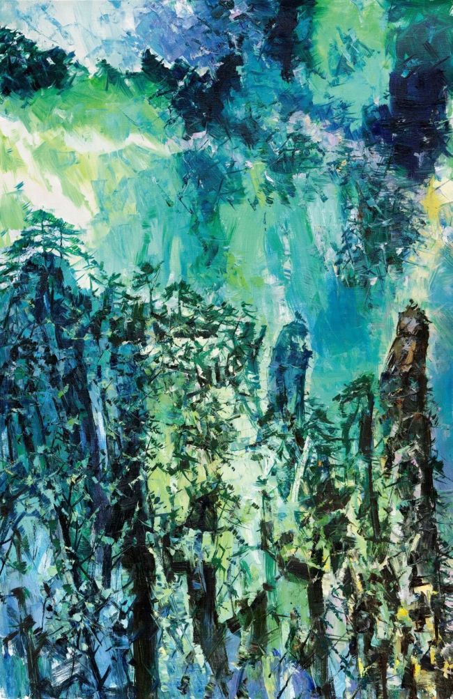 另一类是画雁荡山、神仙居等莽莽大山。这些大山俱是江南名山,先人已有无数登临之迹。我辈复来,自有无尽远怀。南方的山,多奇峰峭崖。峰崖之间,烟云无尽,颇有郭熙《早春图》的无尽意象。靠着云烟翻动,峰峦叠次展开,传递延绵的山水气象。这一批画比较大。我喜欢画这种大画,面对巨幅画布时总有一种冲动:仿佛自身已置身山壑之间,那些大山、深壑如同在肉身中生长,而我们风雨般穿梭其间,胸中满是山锋水芒雕刻下的深痕。