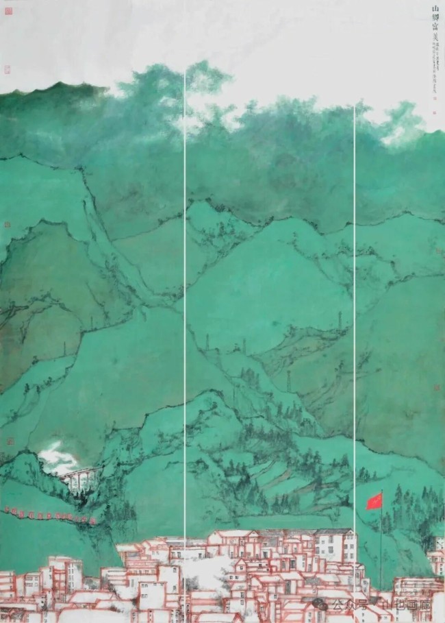 在《湖山仲夏图》中,他以陆浑的自然地貌为底本,却将城市中的高楼、道路、缆车高铁等现代元素嵌入山水之间。画中青绿山峦的温润与玻璃幕墙的冷硬形成强烈对比,传统皴法勾勒的岩石肌理与几何线条切割的建筑轮廓相互碰撞。这种时空的错位并非简单的符号拼贴,而是通过笔墨的虚实处理(如用淡墨晕染雾气模糊建筑与自然的边界)和色彩的冷暖过渡(青绿主调中点缀暖橙色灯光),营造出一种亦真亦幻的“未来考古”现场感——观者既能看到传统山水“澄怀味象”的诗意,又能感受到现代文明对自然的渗透与重构。