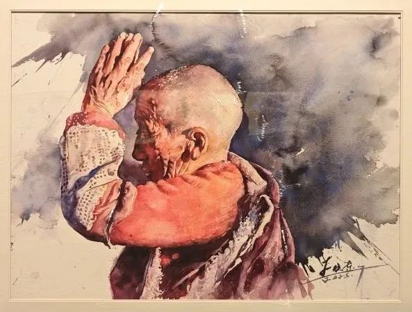 《边疆人物组画》是冯晓东馆长作为一名文化志愿者,先后随地方文旅系统组织的专业文化志愿服务团队赴新疆、西藏、内蒙古、宁夏等少数民族地区开展系列文化惠民服务活动,并以“艺术创作志愿行”为工作目标,精心创作的一批边疆风情系列作品。本次以12件新疆、西藏人物系列水彩画为主题,通过个性化艺术语言,展现边疆自然人文之大美,讴歌边疆地区时代发展新貌。旨在以原创作品为载体,讲好中华民族共同体故事。作品没有选择宏大叙事,而是将视角聚焦于边疆人物个体,从人物的神态、表情与肢体语言中挖掘情感深度。通过细腻的人物刻画让人感受岁月沉淀与生命力量。与许多宏大主题展现的作品不同,《边疆人物组画》着力于微观叙事与人文深耕。从平凡人物的日常发现美与感动,用画笔捕捉那些容易被忽视却又极具代表性的瞬间。展现了创作者对人文精神的深度挖掘与细致呈现,从而赋予作品质朴而深沉的情感力量。它将边疆独特的人文风貌与生活习俗生动地展现出来,让更多人可以通过作品了解边疆文化的多元性与独特魅力,促进不同地域文化间的交流与互鉴。该作品也为水彩(粉)画的创作题材与表现形式提供了新的范例,为地方美术创作的建设与发展留下精彩的一笔。