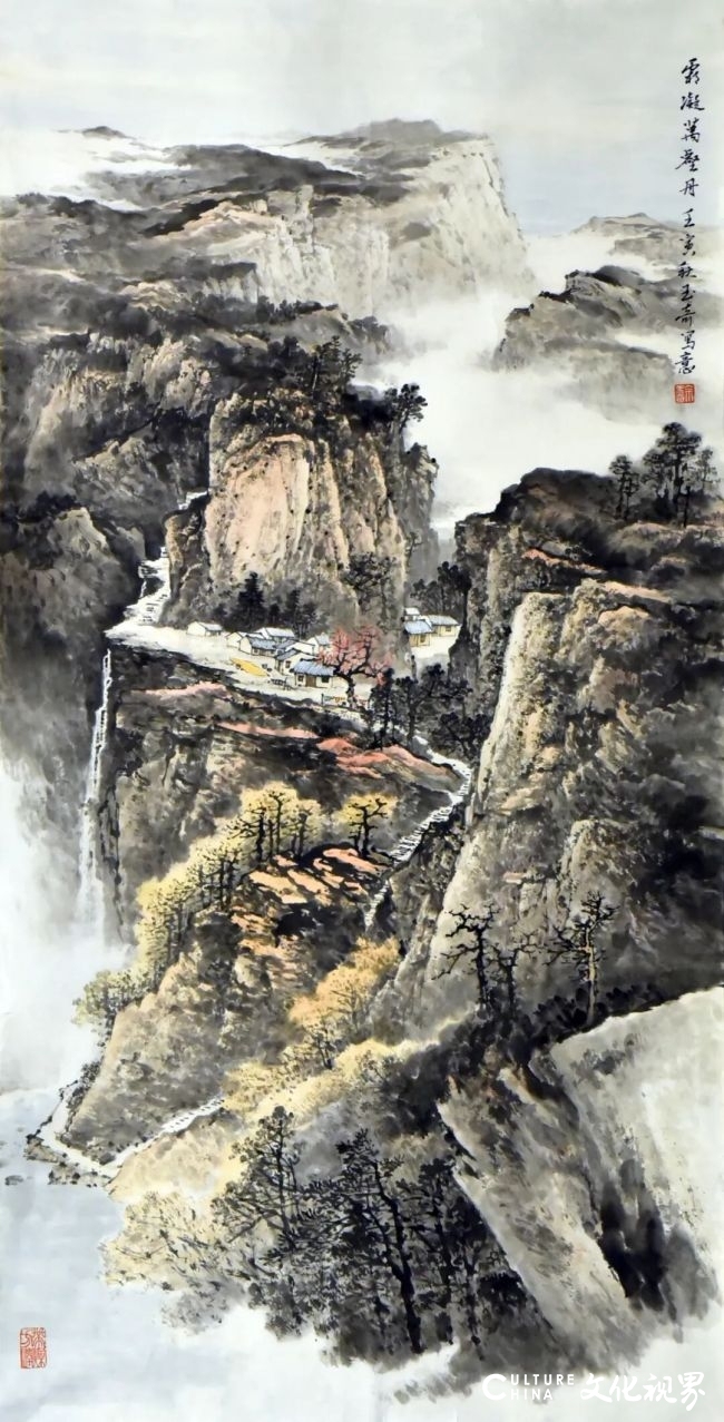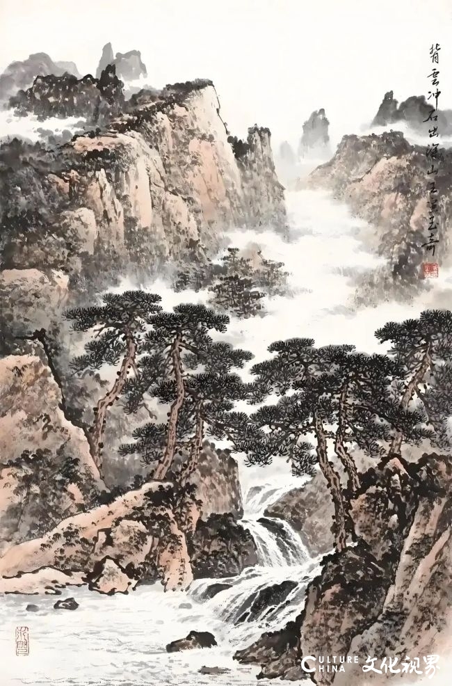 佘玉奇先生以浓重的墨色描绘山峰,以淡墨渲染山间云雾,再用朱砂、朱磦等色点染夕阳照耀下的部分山间岩石,暖色调的红一直蔓延至天际,呈现夕阳下的黄山之景,使画面既有墨的韵味,又有色的美感,不同层次的墨色相互渗透映衬,形成了独特的视觉效果。除了用色,这幅画笔法多样,短而有力的笔触表现了黄山山石的坚硬和棱角分明,中锋用笔描绘出挺拔有力的松干,侧锋笔法表现出自然生动松针,在刻画云雾时,又采用“散锋”的笔法,表现出云雾的轻盈流动。从构图上来看,这幅画采用了全景式的布局,将山峰、云海、松树、溪流等诸多元素纳入画面,云海呈现“S”形分布,引导观者的视线深入画面,增强画面的层次感和深度感,充分展现了黄山的雄伟壮观和神秘莫测,让观者仿佛置身于一个宁静而神秘的自然奇观之中。