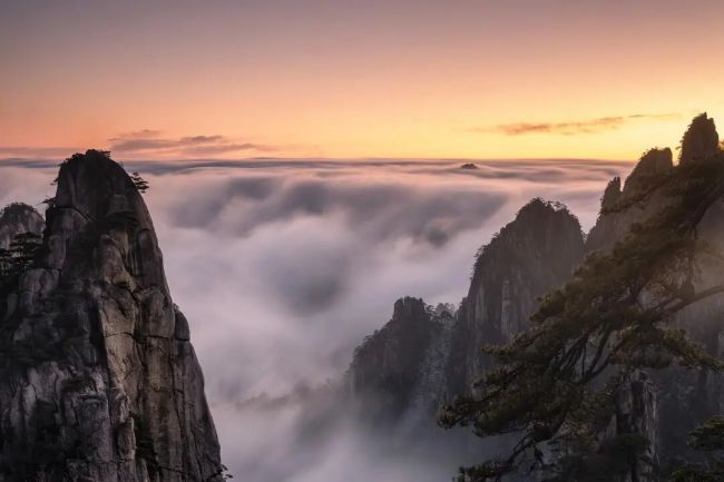相信即使没去过黄山的人,也会记得小时候课本上讲的“奇松、怪石和云海”,还有闻名遐迩的“迎客松”,也是生活中极为常见的图像。为什么黄山会有如此奇崛的自然景象呢?这要从黄山的地形地貌说起,亚热带季风气候和巨大的山体垂直落差,让黄山的冷暖气流频繁交汇,所以这里的云雾形态在短时间内可以发生非常大的变化。黄山一年之中有一半的时间都是雾气弥漫,真真符合了诗词中“云以山为体,山以云为衣”的意境,云海翻涌时与松涛、溪声、怪石互相交融,形成奇妙多彩的自然交响。