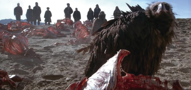 2000年以后,城市化浪潮席卷全国,大型工程、土地开发、资源争夺加剧了人与环境、个体与宏大叙事的冲突。同时,全球化影响深入,生态问题呈现跨国性特征。生态艺术创作更关注具体事件、特定地域和个体在剧烈环境变迁中的生存状态与情感体验,呈现出强烈的在地性与个体叙事性。例如在《三峡好人》(2006)(图15)中,贾樟柯将个体命运嵌入三峡移民的宏大历史叙事。影片借由山、城、水、记忆、日常生活、土地、根、树等一系列丰富意象,生动呈现出历史中的三峡、本地居民的县城生活与重大国家决策及社会变迁之间的挣扎和坚守,从而构建中国独特的生态故事与国家叙事之间的张力关系。陆川2004年拍摄的《可可西里》(图16),守卫与盗猎,雪山与荒原,信仰与贪婪,这些极具张力的视觉意象,共同构筑了可可西里严酷的生态图景,以此强烈控诉了全球资本对当地生态系统的暴力性掠夺。这种聚焦于个体在剧烈发展洪流中的处境与抗争,构成了中国早期生态艺术区别于西方反人类中心主义哲学批判的显著特征。