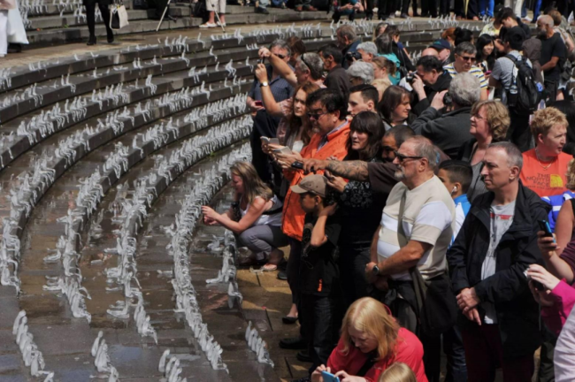 巴西艺术家内莱·阿泽维多的《最小纪念碑》作品(图9)由数千个冰制雕像组成,这些雕塑是高约20厘米的小型男女人像。这些雕像被带到城市的中心广场,并在行人协助下一同摆放,然后任其融化。这是一个非常典型的以协同、参与、共创为艺术的理念,呈现人、城市和自然关系的艺术行动。正如艺术家所言:“生态问题归根结底是一个伦理问题——我们是共同体:土地、水、火、动物、植物与人类,我们应该互相学习,在不将生命等级化的前提下共同生活。”通过数千座冰雕在城市广场的集体消融,构建了一个关于生命脆弱性的临时剧场。作品中“融化人类”的视觉隐喻恰恰能够直指我们经常对气候行动的迟滞和不作为,也以视觉方式呈现了人类与非人类生命体休戚与共的生存现实。