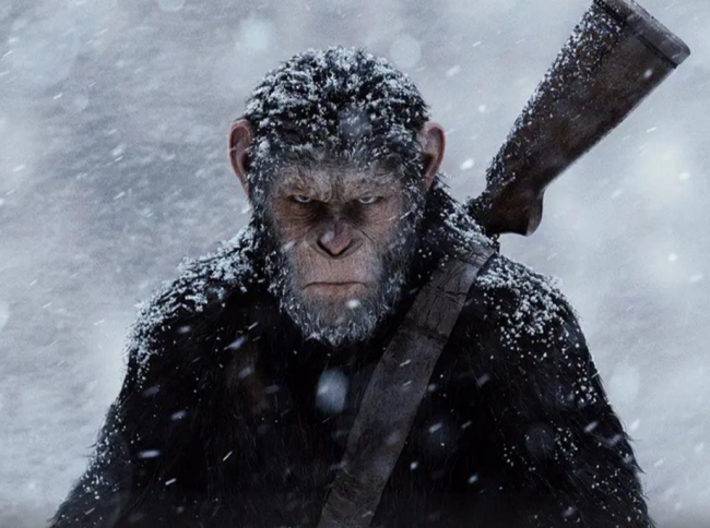 关于星球生态艺术的作品也开始出现。比如,通过数字影像模拟人类消失后的地球景观,展现城市废墟如何被植被侵蚀、基础设施如何被自然力量改造;设想其他非人类动物成为世界的主宰之后人类的命运;从地质时间和宇宙尺度出发,通过对恐龙灭绝这样史前事件的想象,来表达对宇宙未知未来的焦虑隐忧。加拿大摄影师爱德华·伯汀斯基(Edward Burtynsky)的“人类世”项目(图13),以其标志性的宏大视角捕捉全球范围内由采矿、城市化、工业化、废弃物处理等塑造的“人类世地貌”,将人类活动对地球表面的深刻改造呈现为一种新的地质景观,迫使观众直面人类作为地质代理人的巨大规模和深远后果。《猩球崛起》系列电影(图14)则通过虚构叙事,提供了另一种震撼的星球生态艺术图景,它以猿类作为新兴智慧主体取代人类成为地球主宰的设定,视觉化地呈现出“后人类世”星球可能的社会形态,以及人类中心主义崩塌后地球生命秩序的重构可能性,这不仅是对“非人主体主宰世界”命题的具象化演绎,更深刻揭示了人类文明在星球尺度上的脆弱性。这种创作转向不仅反映了艺术主题的扩展,更体现了人类生态意识的深化过程,彻底消解了人类在生态叙事中的绝对主体地位,更多以宇宙尺度和地质时间的维度审视地球命运,将生态思考升维至行星文明层面的生存命题。