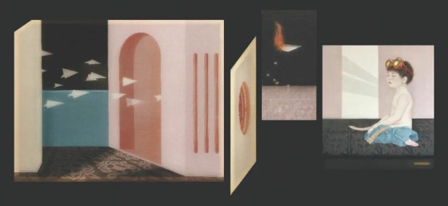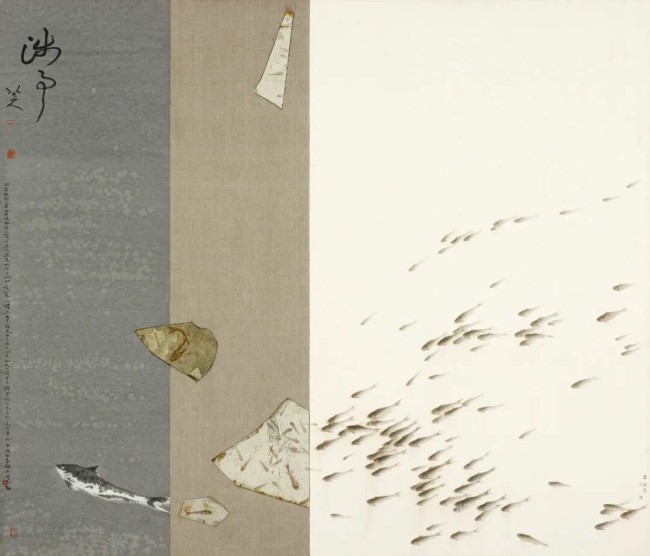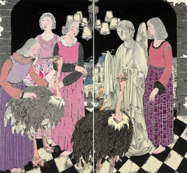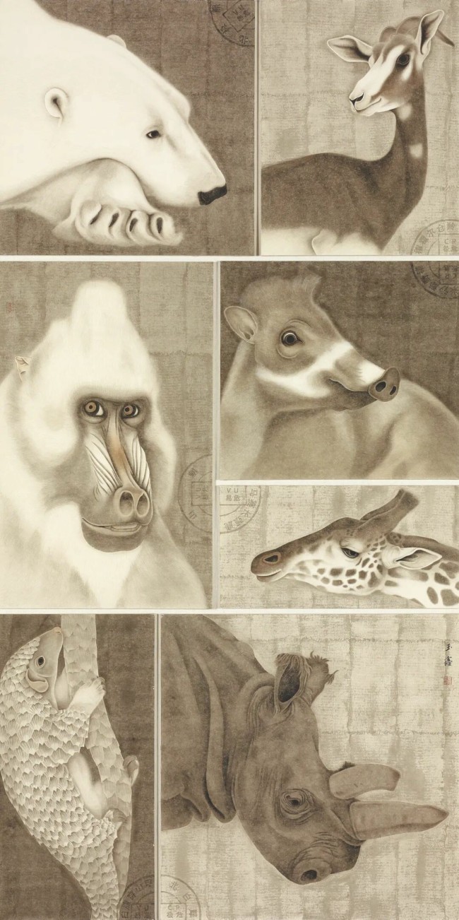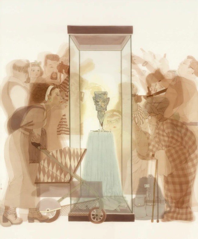 多维度的选材与跨界融合,是当代工笔画创新的又一路径。当代工笔画的题材选择已突破传统的山水、花鸟、人物,而向更广泛的文化领域延伸。如郝孝飞《进化论》、李伟《时光静隅》、毛华《春消息》等,以生态、哲学、山水花鸟重构为内容,呈现了艺术家的独特观察。此外,工笔画与装置艺术、综合绘画的跨界融合,催生了全新的艺术形态。例如,刘吉《时空旅者》和崔强《涉事·朱耷遇见侏罗纪》,通过“水墨+金箔”和“工笔+水墨+生物化石”的独特材料组合与视觉重构,拓展了传统绘画的时空维度。当代工笔画在保证自性的前提下,唯有不断地打破、超越,才能不断地完善,保持生长的张力。