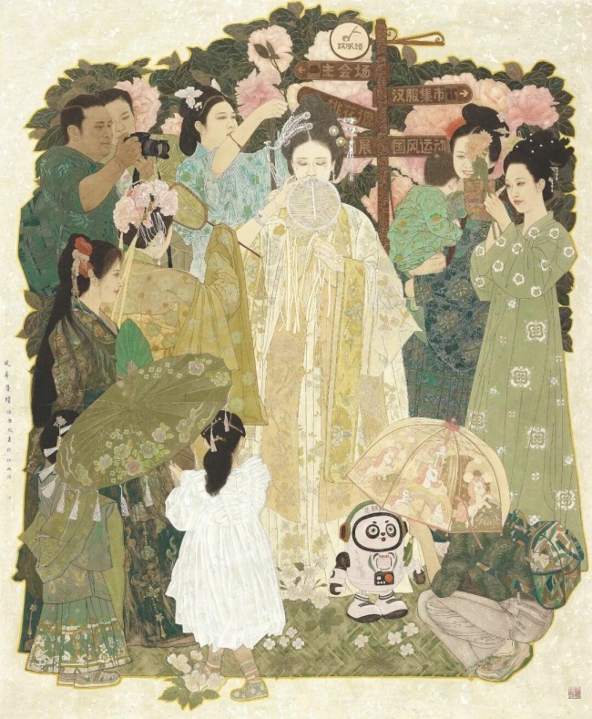 “工成当代,固本开新”是本届展览的主题,更是中国工笔画在新时代的发展宣言。“工成当代”既指工笔画技艺之精工,更彰显工笔画在新时代艺术格局中的契合与担当;“固本开新”则是指以东方美学为根基,在传承中创造属于这个时代的工笔新视界。本次展览直面三重学术命题:在技法层面,探讨“尽精微”描绘如何升华为“意象性”文化表达,这涉及工笔画从形质描摹到精神传达的艺术本体建构;在创作范式层面,探讨固态程式如何孕育自主思考,实质上是对传统法则与现代性创造之间辩证关系的深刻认识;在技术革新层面,回应AI介入背景下“守正创新”的底层逻辑,关乎文化基因在当代的延续与发展。这些问题不仅是对工笔画本体语言变革的学术追问,更是对中华文化现代转型的深层思索,同时也是对全球化背景下文化创新的深刻回应,以及与国家意志的同频共振。此次参展的艺术家们以东方美学为底蕴,从新时代的火热生活中汲取创作灵感。他们不仅合理运用了西方的色彩、造型科学及现代技法,还对唐宋经典及民间艺术进行了当代转化,更在新媒介领域进行了重构视觉时空的实验性探索。其中,青年艺术家尤为引人注目,他们以新锐的姿态和开放的视野,突破传统范式,为工笔画注入了蓬勃的生机。这些作品无论是关注现实还是讴歌情感,都充分展现了固本开新的艺术追求。