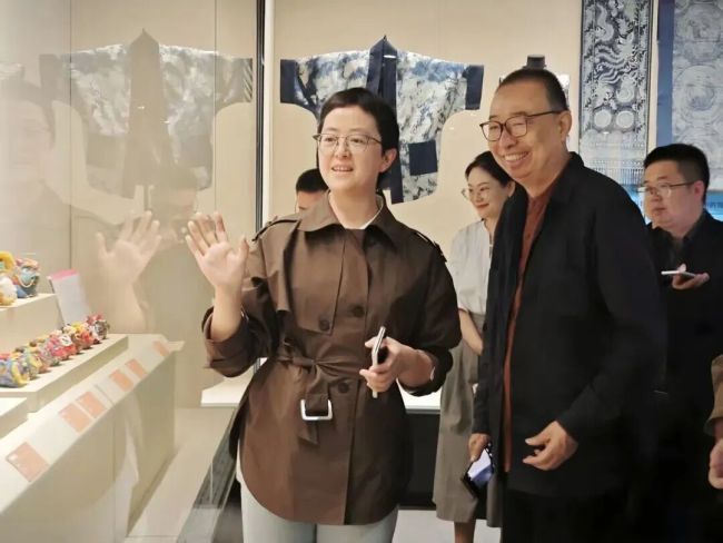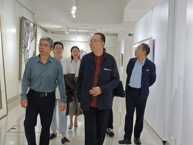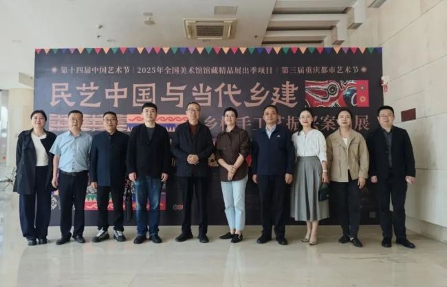 当天上午,潘鲁生首先参观了“民艺中国与当代乡建乡村手工艺振兴案例展”。该展览集中呈现了国内近年来在乡村手工艺振兴中的实践成果,从苏绣的创新设计到綦江版画的当代转化,从自贡彩灯的活态传承到夹江造纸的匠心坚守,用一件件展品串联起民间工艺的振兴脉络。重庆市文联副主席、市民协主席谢亚平陪同参观,并细致介绍了每件作品背后的文化故事与技艺传承。潘鲁生饶有兴致地驻足观看,不时询问工艺细节与传承现状,对重庆在民间工艺保护与活化方面的探索给予高度评价,认为这些实践“扎根乡土、连接现代,为民间工艺注入了新的生命力”,同时他指出,要特别注意乡村手工艺振兴不是对乡村文化的单边介入,而是互相学习借鉴,形成多极文化融通。
