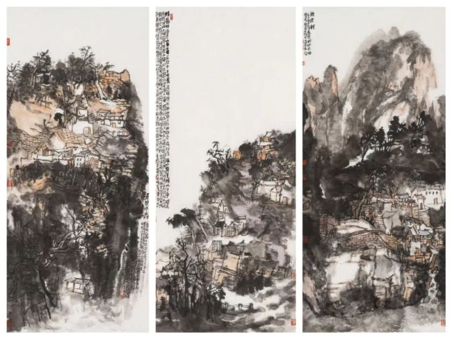 左:《黄贝坪古村》贾荣志作中:《蟒岩村》贾荣志作右:《西庄村》贾荣志作