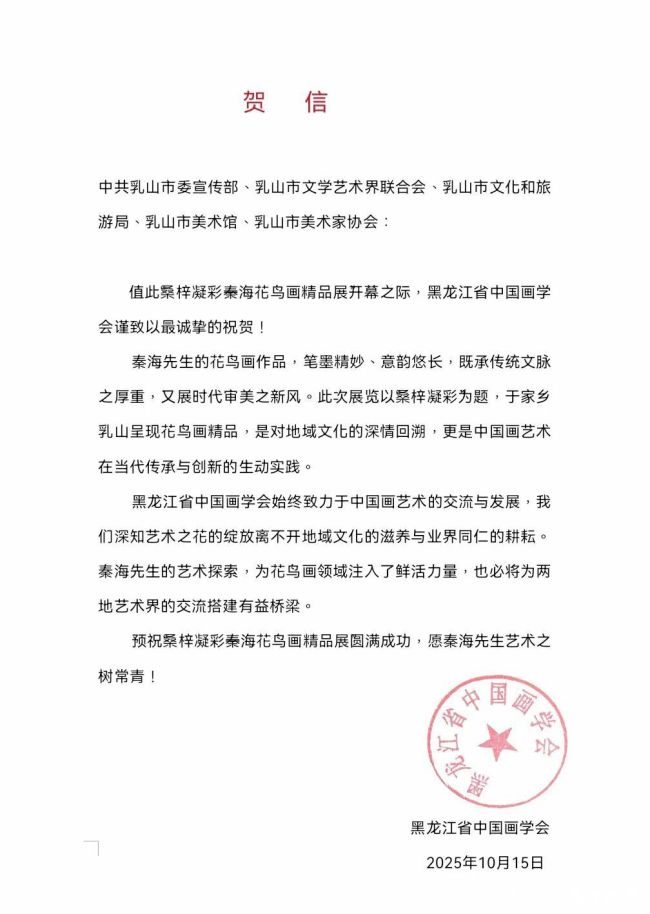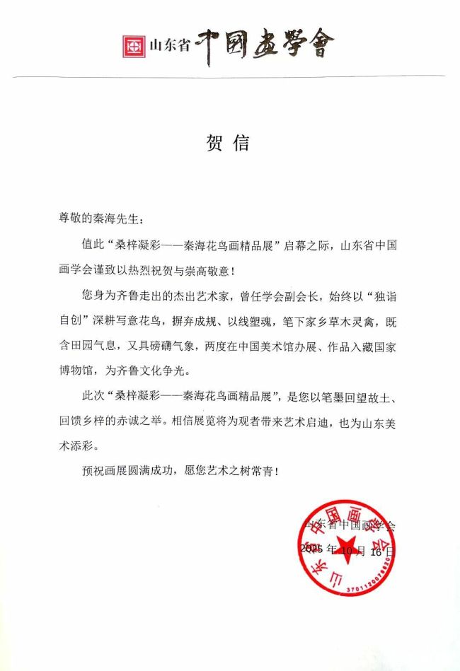 欣悉秦海先生在乳山老家举办画展,冠以“桑梓凝彩〞之名,让优秀文化资源直达基层,艺情两合,深以为然,并表衷心祝贺!