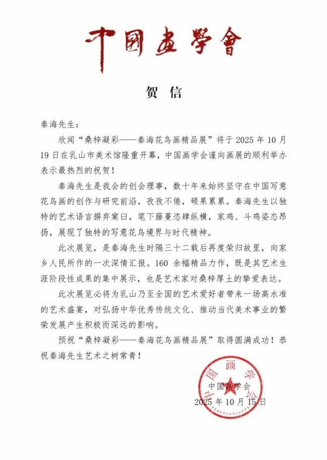 欣闻秦海先生应邀在家乡举办个展,谨表示热烈祝贺!