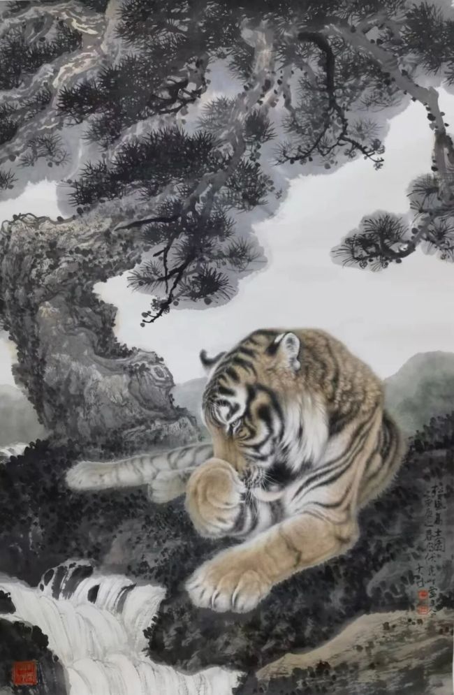 在冯大中的笔下,无论是威震山林的猛虎,还是静谧安详的卧虎,都透出强烈的生命性。他画虎,不止于形似,更追求神似;不止于描绘虎的外在形态,更致力于表现虎的内在精神。他深入观察虎的习性,长期写生,将虎的每一个姿态、每一种神情内化为心中的意象,再通过笔墨外化为艺术的形象。这种生命性还体现在他的山水与花鸟作品中——山有魂魄,水有灵气,花有性情,鸟有神采。在他的艺术世界里,万物有灵,生命互通,形成了生机勃勃的生态系统。