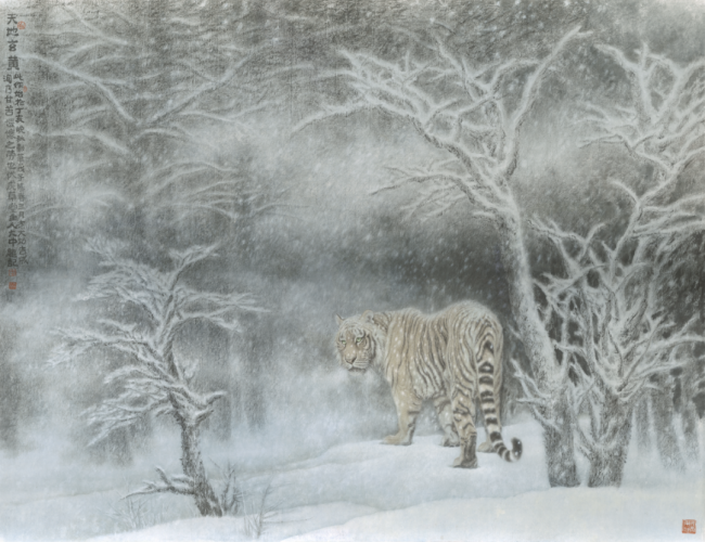 冯大中的艺术世界,首先彰显出强烈的风格独立性。在数十年的艺术探索中,他成功地避开了两种陷阱——对传统的简单复制和对西方的盲目追随。他的工笔虎,精微处不失气韵,细密中蕴含空灵;他的写意虎,奔放时不失法度,简约中深藏意境。更为难得的是,他将工笔的精谨与写意的洒脱融会贯通,创造出一种既非纯粹工笔亦非纯粹写意的“中间语言”。这种独立性不是刻意的标新立异,而是长期艺术修炼后的自然流露,是艺术家内心世界与表现形式的高度统一。