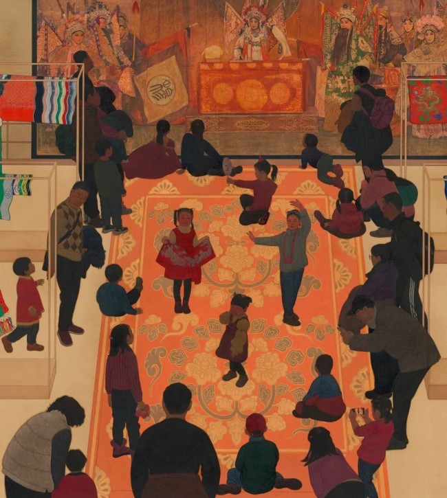 中国画《梨园回响》以戏曲文化为视觉纽带,画面中的华美戏服与多彩纹样,承载着各民族传统文化交融的历史印记;孩童模仿传承国粹的生动场景,则是民族文化血脉延续的鲜活缩影。作品深刻诠释了中华优秀传统文化的强大凝聚力,它润物无声地链接着共同的文化记忆,滋养着深沉的身份认同,为构筑中华民族共有精神家园注入了源源不断的生命力与情感力量。