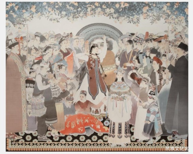 这幅题为《石榴花开心向党·同心共筑中国梦》的中国画,生动描绘了中华民族大家庭载歌载舞、共庆盛世的欢乐景象。作品以在铸牢中华民族共同体意识主线工作中涌现的时代楷模与英雄模范为主要人物形象,通过艺术手法展现他们的精神风貌。画面构图精妙,上方累累石榴果实与下方织绣而成的“同心共筑中国梦”字样相互呼应、融为一体,巧妙点明“石榴花开心向党·同心共筑中国梦”的创作主题,艺术化地诠释了“各民族像石榴籽一样紧紧抱在一起”的深刻内涵,展现了中华民族一家亲的团结氛围。