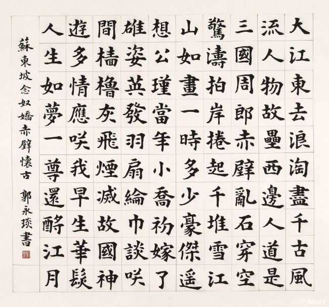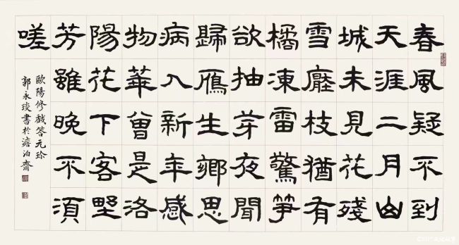 郭永琰的艺术根基深植于中国传统文化的沃土。在书法领域,他精研楷、行、草、隶、篆诸体,尤以楷书和行草见长。其楷书取法晋唐,得魏楷之古朴、隋楷之雅致、唐楷之雄浑,结体严谨而气韵生动。在书法风格的塑造上,他形成了独特的“欧底魏面”特点——楷书取欧阳询字结体的险峻茂密之气,同时掺入北朝碑刻的冲淡质朴,形成了超脱世俗、清新雅健的艺术语言。他从欧阳询《九成宫》碑入手,悟其神理,得劲拔险峻之趣。他还取《郑文公》碑之沉着凝重、《张猛龙》碑之浑厚刚劲、《岳麓山》碑之茂密纯朴、《雁塔圣教序》碑之体势秀逸,融会贯通,尤得《张黑女》碑平静简约、遒厚精古之神采。笔走龙蛇间,让千年书法传统在当代焕发新生。