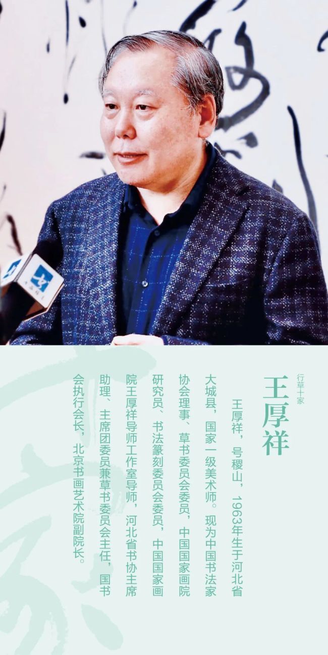 王厚祥,号稷山,1963年生于河北省大城县,一级美术师。现为中国书法家协会理事、草书委员会委员,中国国家画院研究员、书法篆刻委员会委员,中国国家画院王厚祥导师工作室导师,河北省书协主席助理、主席团委员兼草书委员会主任,国书会执行会长,北京书画艺术院副院长,清华美院客座专家。
