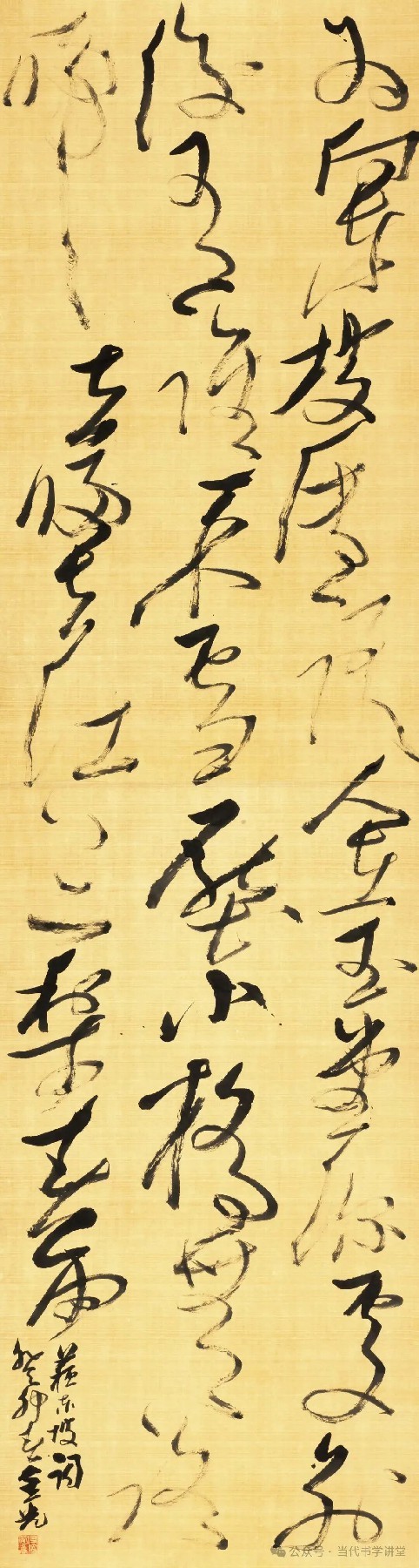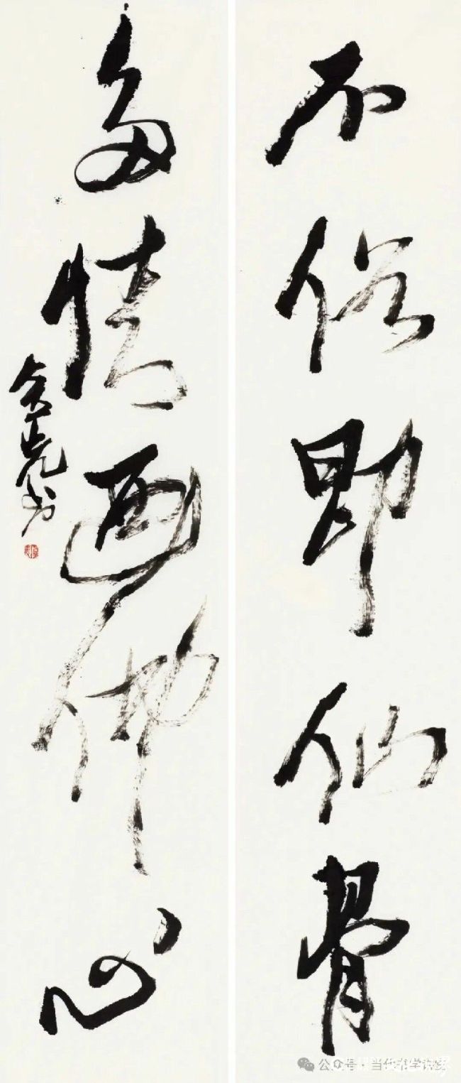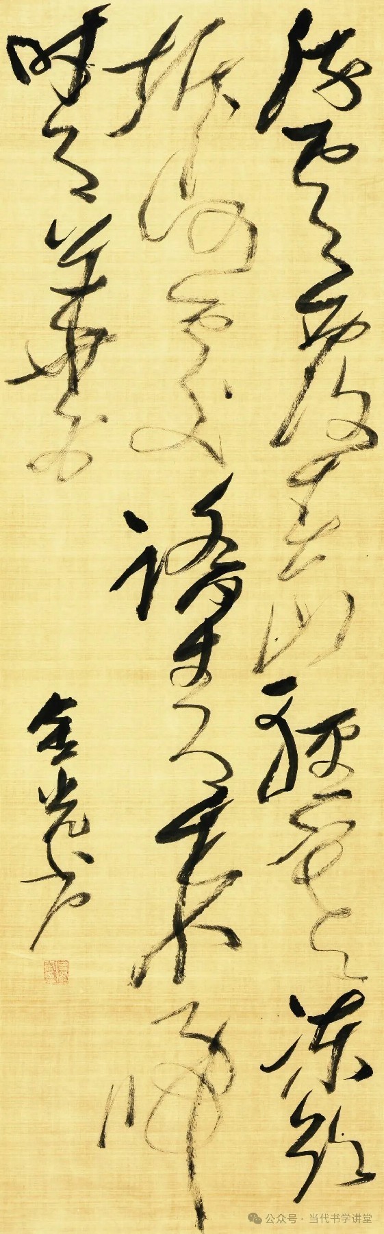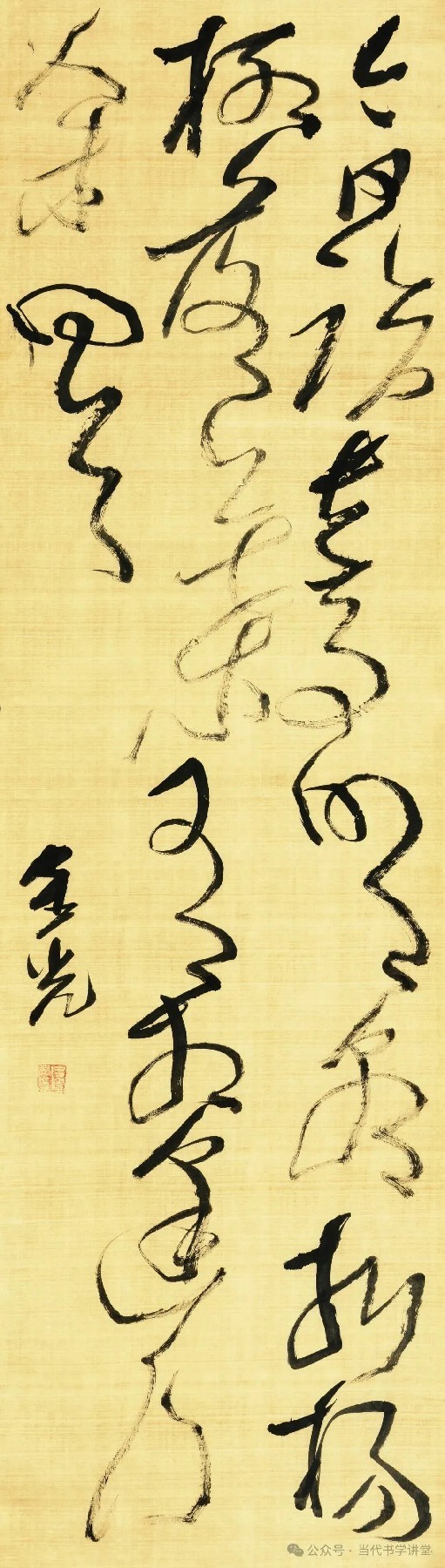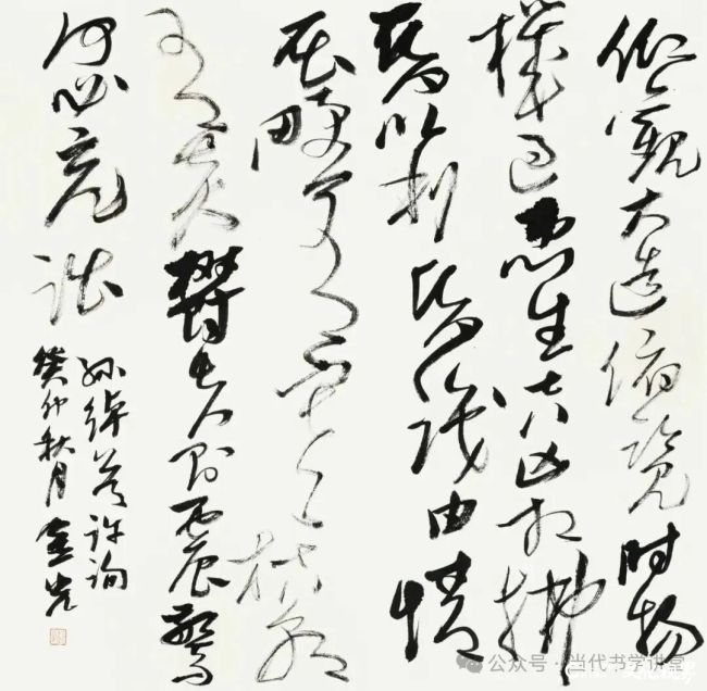 这种“金光图式”,是他在章法、结字、墨法以及意境营造上的全新创造,更是他对中国传统文化深刻觉醒与顿悟的体现。他巧妙融入西方格式塔心理学“部分之和大于整体”的美学理念,同时赋予其东方的哲学内涵,形成了克莱夫・贝尔所说的“有意味的形式”。他的结字奇崛多变,收放自如;墨法枯润相生,层次丰富;章法大开大合,虚实相生。他凭直觉运笔,写出的线条既果断又灵动,既连绵又劲挺,既刚健又温润,共同营造出深邃悠远的意境。这一切共同构成了脱胎换骨的“金光图式”,已然深深烙印在每一位观者的心中。