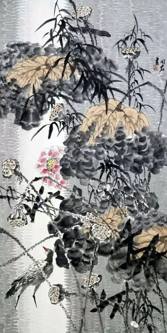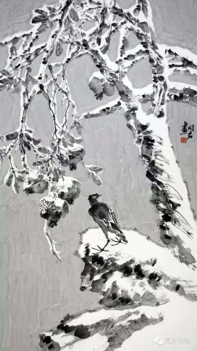 说起王同君,北方花鸟画的代表之一,却没有高枕无忧,安步当车,喜上眉梢。突破是每一个画家面临的命题,原地踏步就是后退,今天的画坛新人辈出,技法与技巧,观念与价值,颠覆与创新,花样繁多,一不留神开宗立派登上头条。同君虽不甘寂寞,却也不善于钻营炒作,踏实做人老实画画,如何突破自己无疑刀口撒盐,痛苦是必然的。同君给了我们极大的惊喜,由“北国系列”、“青绿花鸟系列”到“荷塘系列”再到“雪景寒禽系列”,跨栏式的飞跃,恍如一夜间发生的事情。因为同君的低调,同君的沉默,只在无声无息中,夜以继日,埋头苦干,究竟画坏了多少张我们不知道,却知道没有捷径的妙方,呕心沥血一定是要有的。