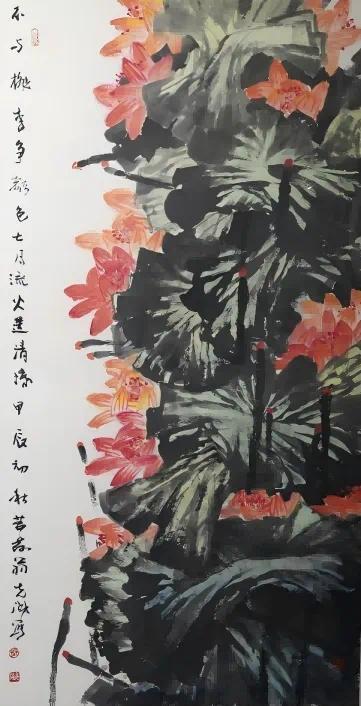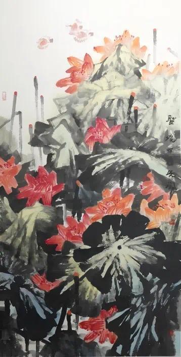 这幅作品是赵先闻“传统现代转化”艺术理念的凝练呈现。他大胆突破文人画的水墨范式,以浓烈的红橙色调塑造荷花主体,在视觉上形成强烈冲击;墨色荷叶以丰富的浓淡层次铺陈,宛如“墨分五色”美学的当代演绎。在构图上,画面饱满却无窒碍,荷花、荷叶与荷梗的排布暗含现代构成逻辑,既延续了传统花鸟画的自然生机,又赋予画面以结构性的视觉张力。