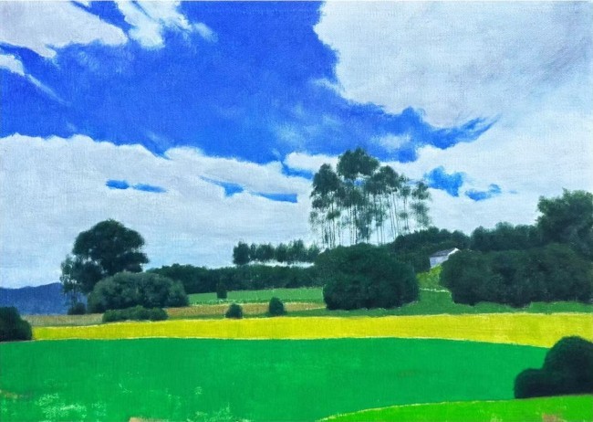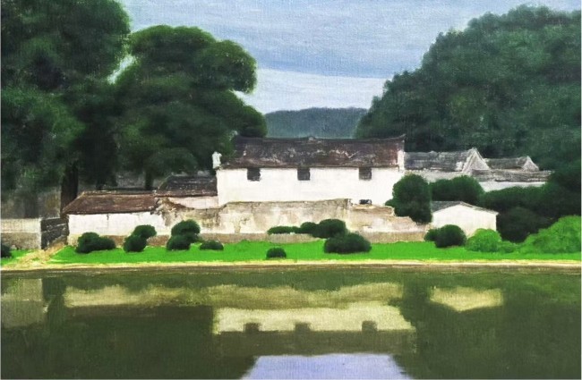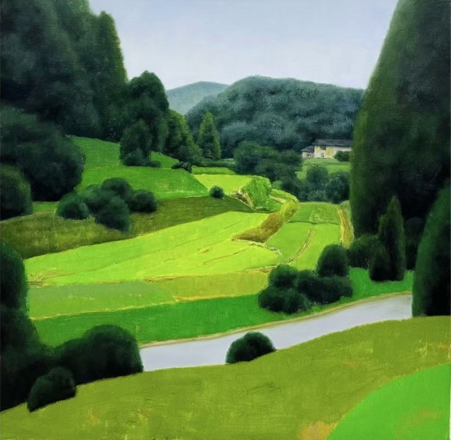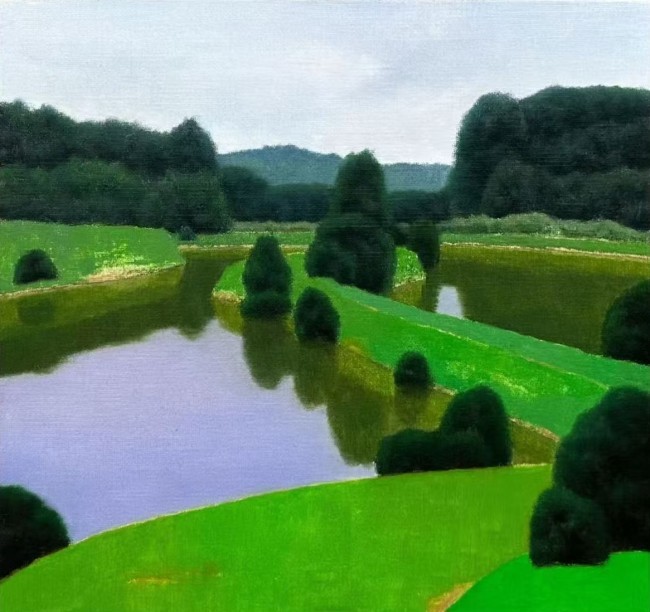 在他的画布上,那自然天成、朴实清澈的风貌背后,是对简素质实创作立场的坚守。他的写实,并非对物象的机械摹写,而是带着生命温度的呈现。这种呈现,将市井草根的火热、大地耕作的质朴、生态和谐的静美熔于一炉,让寻常习见的乡野风景升华为承载生命情致的美学载体。正如他笔下的每一抹绿色,都不是单纯的色彩符号,而是江南草木在四季轮回中勃发的生命节律;每一处水域,都映照着天空的云影与人心的澄澈,成为自然与人文对话的媒介。