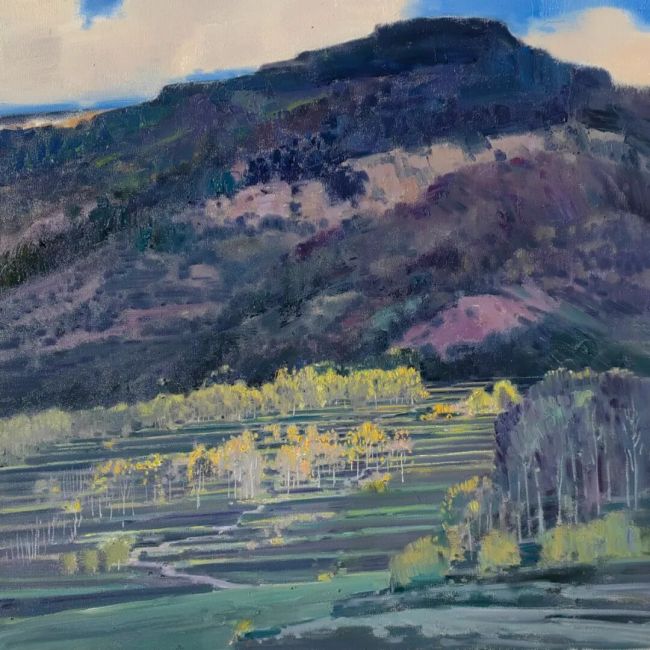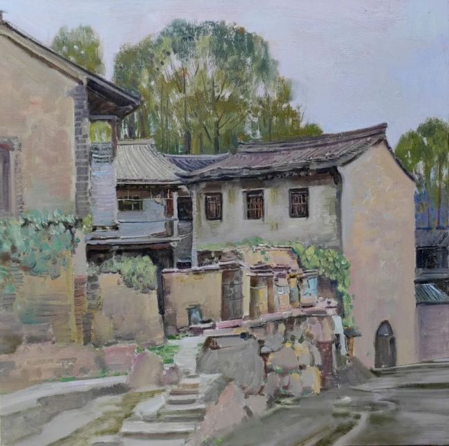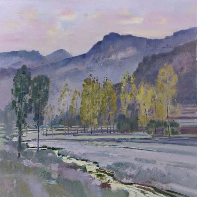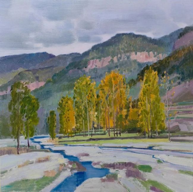 当李洋的画作映入眼帘,时间仿佛在画布上放缓了脚步。他的画作恰似一汪被时光淘洗却愈发清透的碧潭,以其独有的绘画语言与色彩感知,在自然风貌的描摹中完成了对地域精神的深度解构与艺术重构。