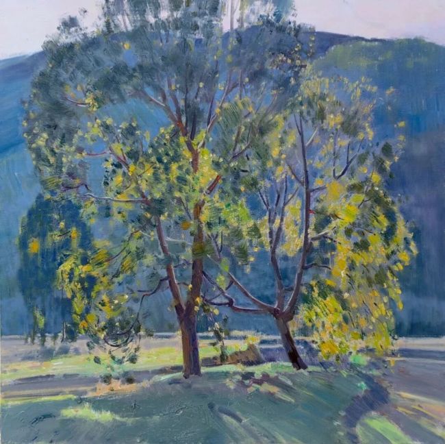 李洋对色彩的驾驭,绝非对物象表象的简单摹写,而是一场对自然情绪的敏锐捕捉与创造性转译。在其画作里,色彩是有呼吸、有温度的生命存在。他擅长在色彩的冷暖碰撞中营造叙事节奏。冷调的远山如一层朦胧的薄纱,拉开了空间的纵深;暖调的近树似一簇跳动的火焰,锚定了视觉的焦点。这种冷暖的对话,是对自然本真状态的精神提炼——他让观者看到的,不仅是眼睛所及的风景,更是心灵所感的境界。这种色彩语言,直接作用于观者的情感与潜意识,我们不仅“看见”了风景,更“感受”到了温度、湿度以及那份萦绕于心的情绪。色彩,于此成为了连接可见世界与不可言说之内心境遇的桥梁。