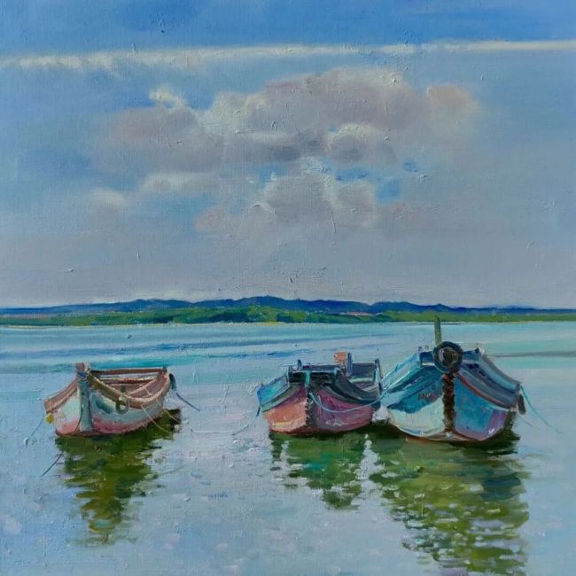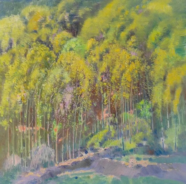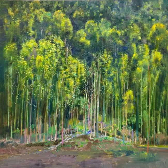 李洋的笔触,是其风景油画中极具辨识度的艺术语言。他的笔触绝非漫无目的的涂抹,而是带着对自然肌理的深刻洞察,在画布上留下的生命痕迹。那些刻画山石的粗犷笔触,是大地褶皱里沉淀的岁月沧桑;那些描绘树叶的细碎笔触,似雀跃的音符,是林间清风中舞动的生命韵律。在大的色块铺陈之后,他以灵动的笔触进行细节的雕琢与气韵的贯通,让每一次落笔都既服务于整体的塑造,又独立成趣,形成一种“笔笔相生,处处见情”的艺术效果。他笔下的风景不再是静态的摹写,而是动态的生命景观,观者能从那些或疾或徐、或重或轻的笔触中,感受到风的吹拂、光的跳跃、水的流动,仿佛整幅画都在呼吸,在生长。