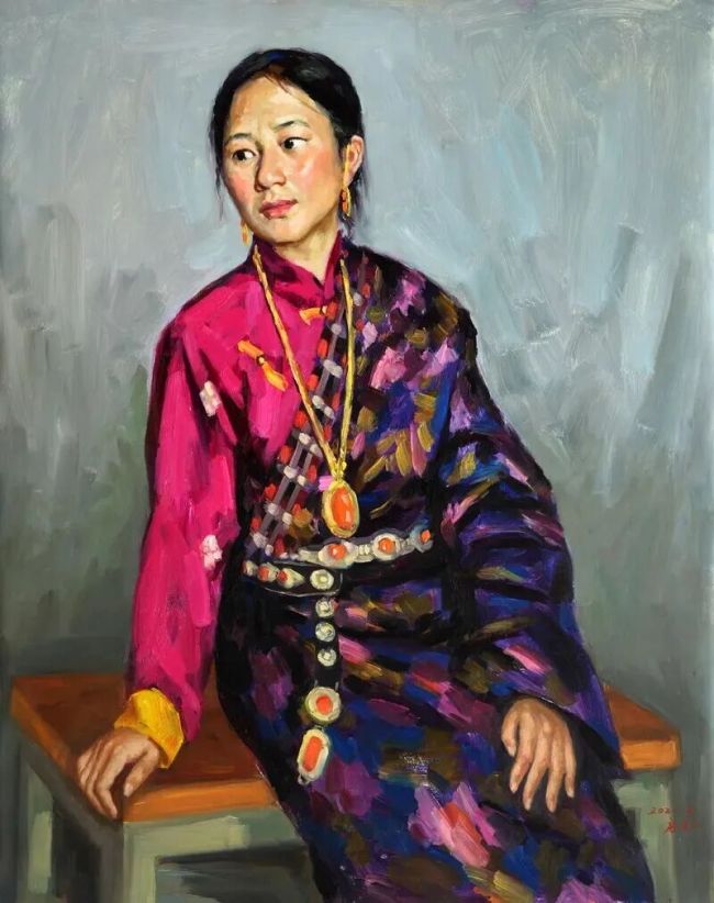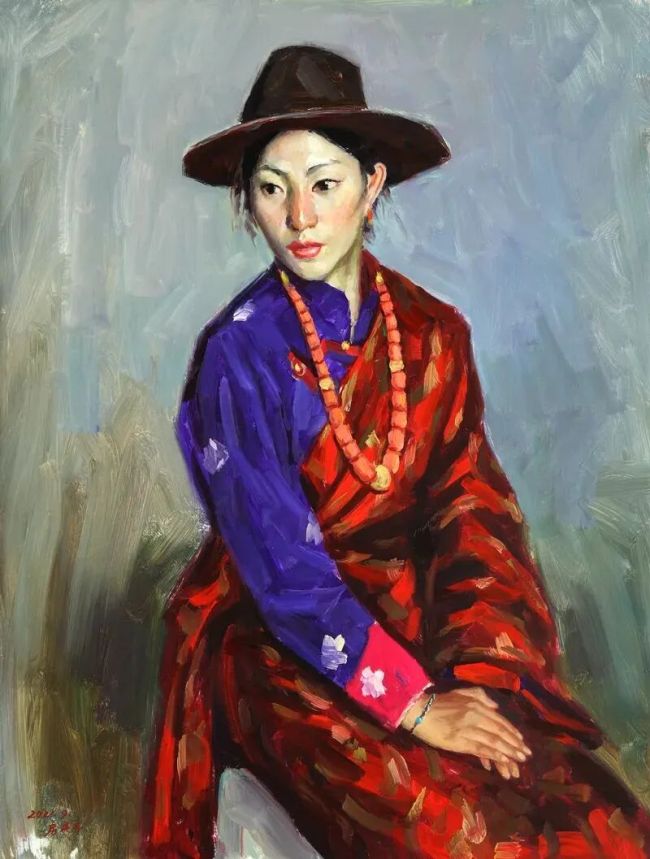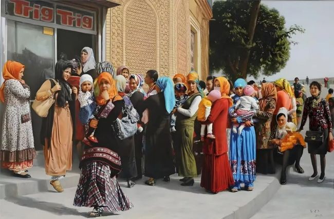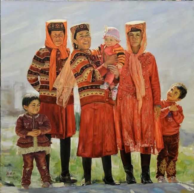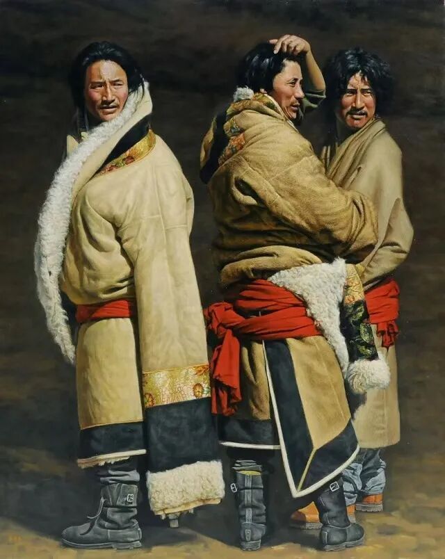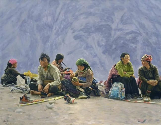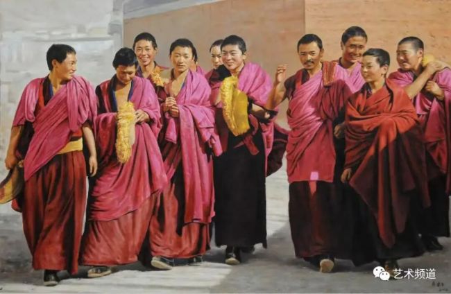 我理解的审美,其实就是审趣,趣之不存,何美之有?凡生趣、景趣、形趣、意趣、理趣,都是美,美而有意,美而有味!房先生的油画创作以真为基,同时追求意味和趣味,富有中国水墨画的味儿。譬如他的《吉日》,一群妇女和她们怀抱着孩子,各异形貌,异趣纷呈,耐人琢磨。再譬如《暖阳》,十来个青年喇嘛,衣着类似,表现却各不相同,特别是脸部表情,喜悦之情油然而出,似阳光照亮每位僧侣的心灵。意在象外,趣在细节,共同烘托出一个庄严的主题:暖阳。