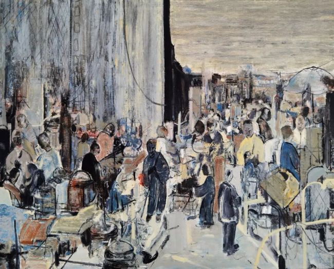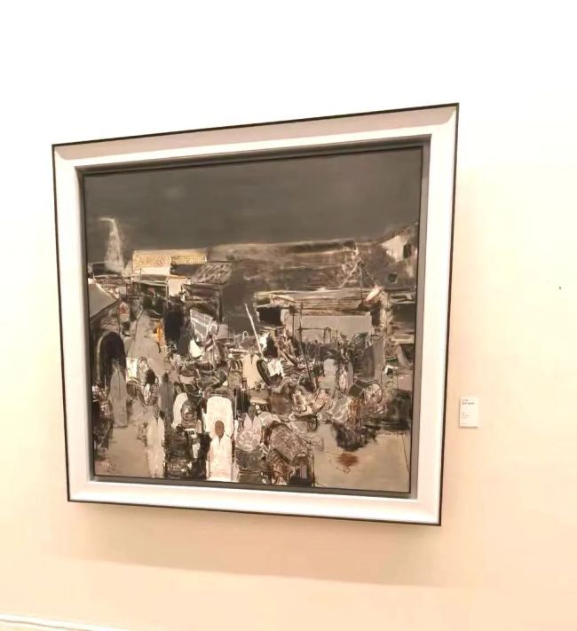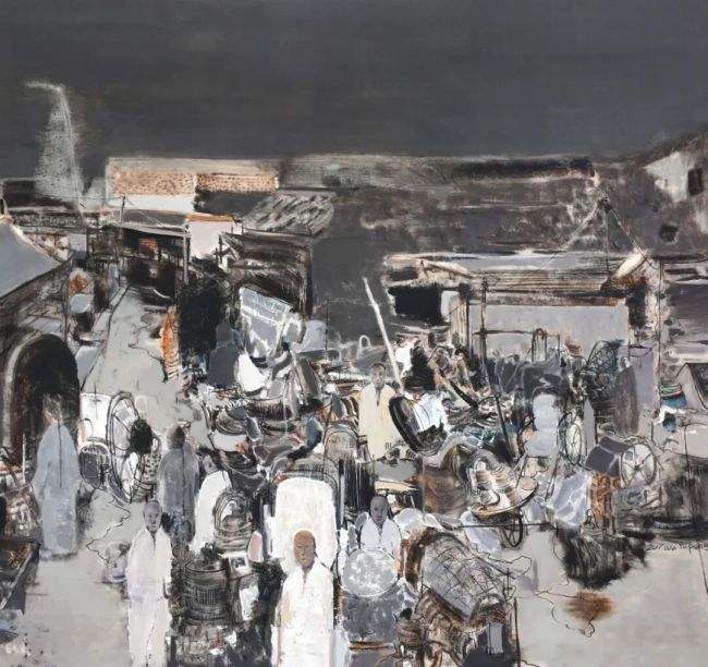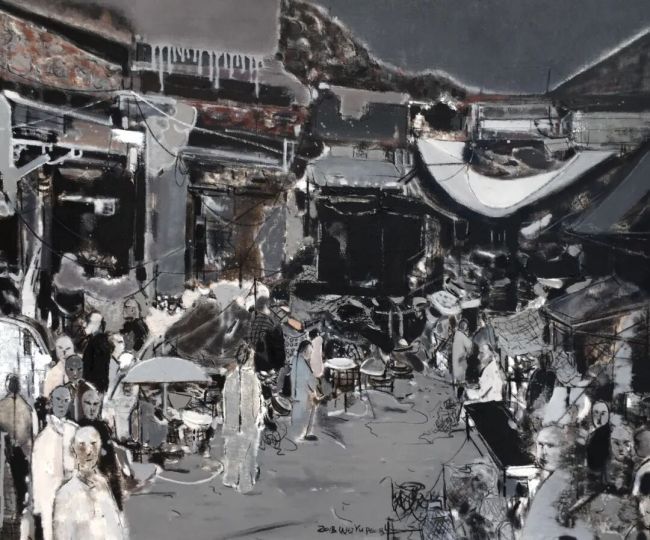 《北平1898》的语言内核,是油画媒材对中国写意美学的深度适配。画面以黑、白、灰为主调,赭石与赭黄的零星点缀如历史尘埃的余温,摒弃了西方油画的焦点透视与色彩铺陈逻辑,转而以“计白当黑”的东方构图法则,让画面的空白与墨色肌理形成呼吸感。艺术家以刮刀、画笔的交替运用,在画布上制造出刮擦、堆叠、晕染的肌理层次:建筑的轮廓以狂放的线条勾勒,如书法中的“飞白”,既保留了老北平街巷的结构骨架,又消解了具象写实的刻板;人群的形象则以块面与线条的糅合呈现,模糊的面容与简化的形体,并非对现实的失真再现,而是写意美学中“以形写神”的当代实践——通过抽离具象细节,让观者聚焦于1898年北平民众集体的精神状态:在时代变局前的迷茫、拥挤与暗流涌动。