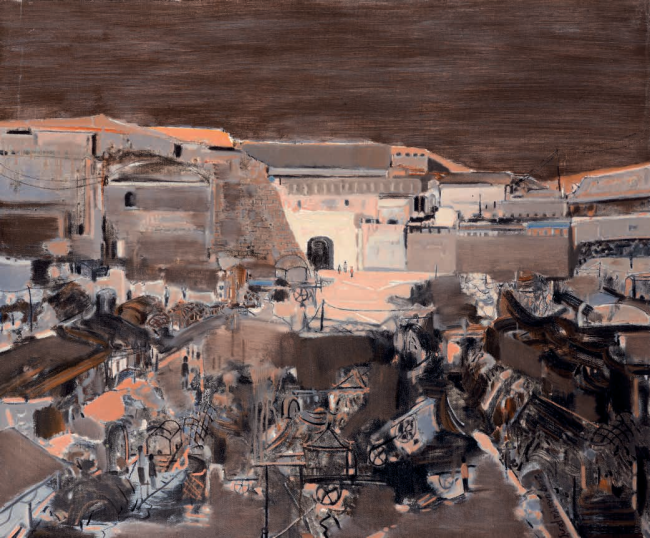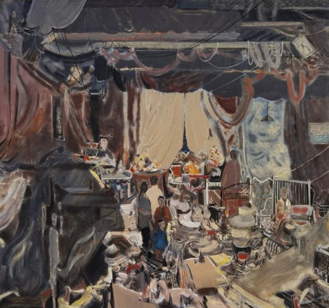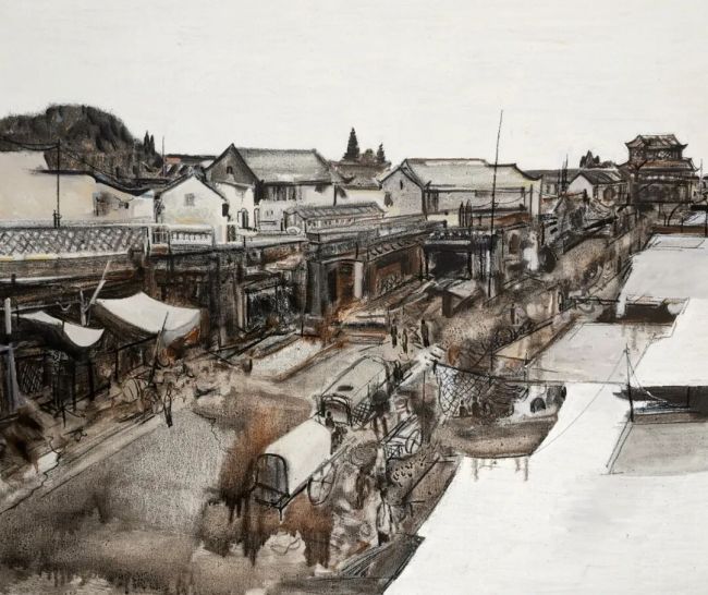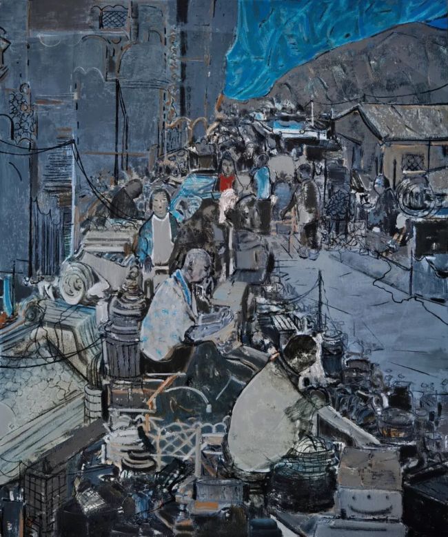 这种笔法的写意性,打破了油画“塑形”的传统认知,将中国水墨画的“写”与油画的“绘”熔于一炉。画面中交错的线条如书法的行草,随性却不失章法,既勾勒出街巷的空间纵深感,又成为情绪的载体;厚涂的油彩肌理则如传统水墨的积墨法,层层叠加出历史的厚重感,让1898年的北平不再是平面的风景,而是可触摸、可感知的时空场域。