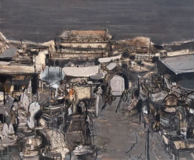 画面中人物的形象处理极具深意:身着传统服饰的民众以模糊的群像呈现,个体的特征被消解,成为晚清社会集体的符号化象征。他们拥挤在街巷中,方向不明的动态暗示着时代的迷茫;背景中暗沉的色域与破碎的建筑轮廓,则隐喻着旧秩序的崩解与新变局的未知。艺术家以写意的手法抽离了历史的具象细节,却让历史的精神内核“在场”——1898年北平的压抑、躁动与变革的潜流,都通过视觉语言的写意表达,直抵观者的精神感知。这种叙事方式,超越了历史画的纪实性桎梏,让历史不再是遥远的故纸堆,而是与当代观者产生精神共鸣的情感体验。