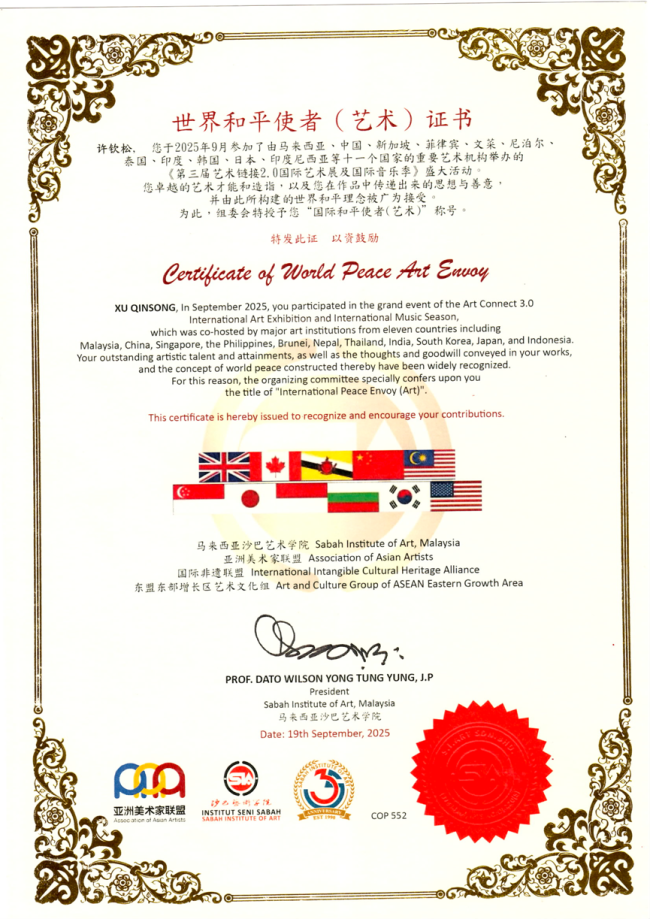 这一殊荣由沙巴艺术学院、亚洲美术家联盟、国际非物质文化遗产联盟以及东盟东部增长区艺术文化组联合颁发,充分肯定了许钦松在推动国际文化艺术交流、促进世界和平事业方面的卓越贡献。