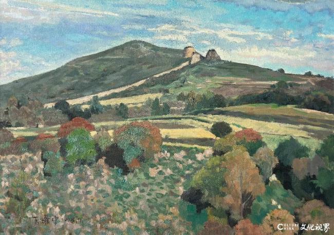 笔触是他画面里鲜明的“语气”——不是细腻到消弭手工痕迹的光滑,而是带着肌理的、略显松快的铺陈。像石榴的果实在厚涂的色块里透出沉甸甸的质感,果皮的褶皱借着笔锋的转折裹着天光;人物衣料的纹路则顺着肢体的弧度生长,蓝布衫的沉、头巾的红,都在笔锋的轻重里沾着生活的温度;即便是远景的山峦,也以短促的色块堆叠出层叠的肌理,让荒疏的崖壁也裹着柔和的暮色。这种“松而不散”的笔意,既守住了物象的形,又让画面跳出了刻板的写实,多了几分写意的松弛。