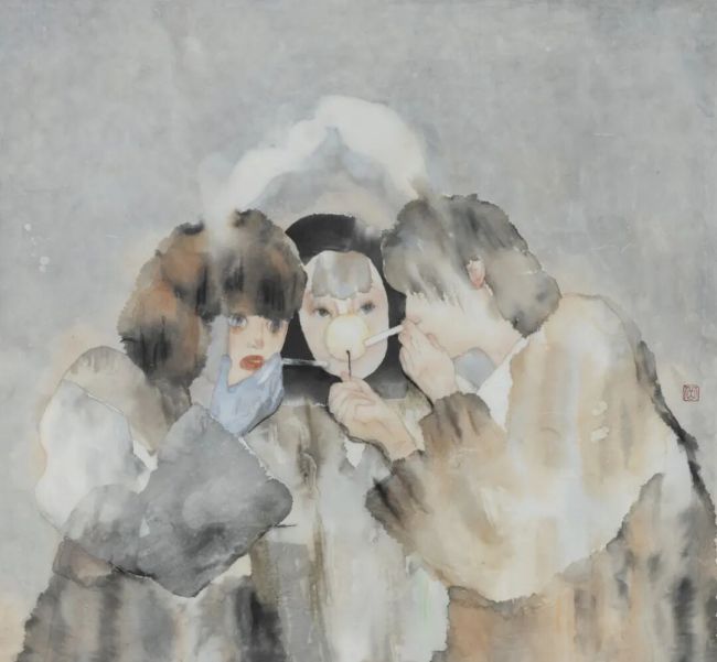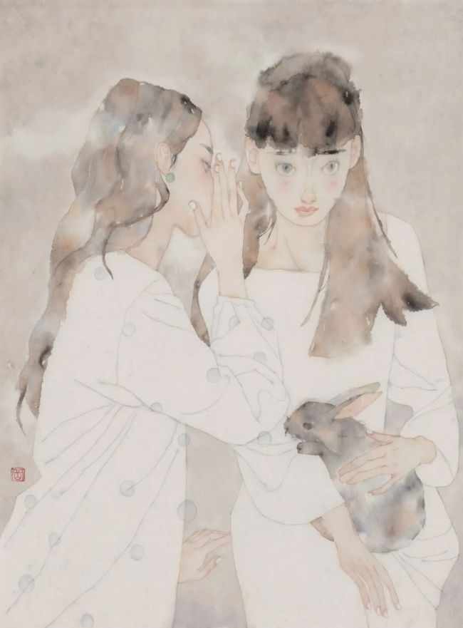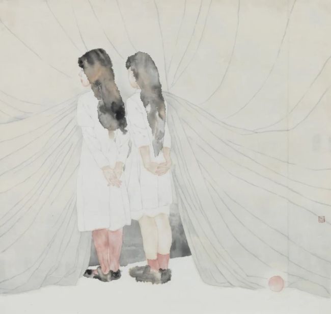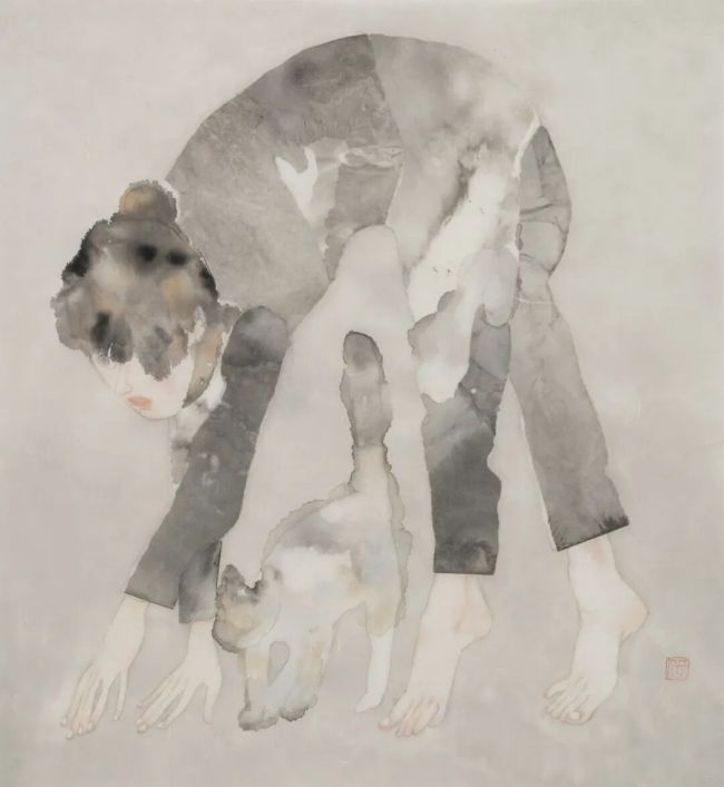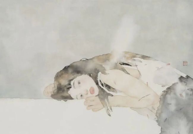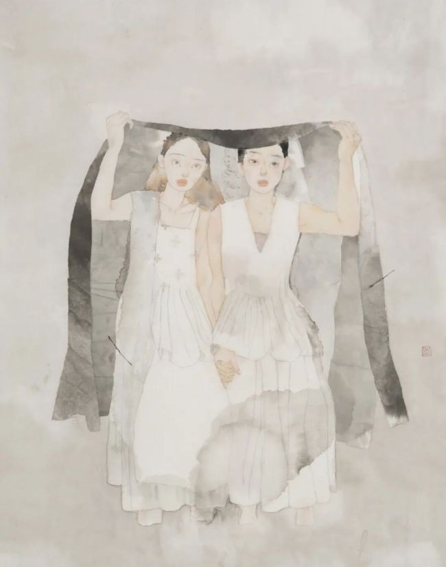 小飞自幼受到的教育和教养都是一流的,教育带来技能,教养赋予气质。她的作品处处散发着含蓄、矜持和漫不经心的自由,用笔是轻柔的,人物状态是松弛的,几乎透明的设色和局部巧妙的拼贴,斑驳而丰富,作品轻声慢语,如入梦境。她并不试图制造戏剧性的瞬间,而是把视线放在某些容易被忽略的时刻——那些“停下来之前”、“犹豫之中”、“尚未决定的时候”。因此,她的水墨语言在这里便显得格外恰当,它轻、淡、留白多,线条从容展开,色块慢慢蔓延,情绪被收在了很低的位置。不提出问题,因为当下即是答案。
