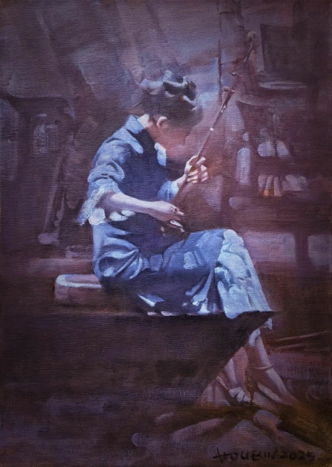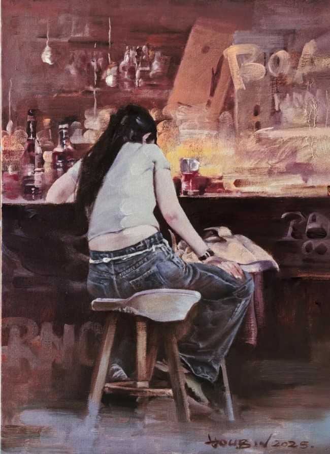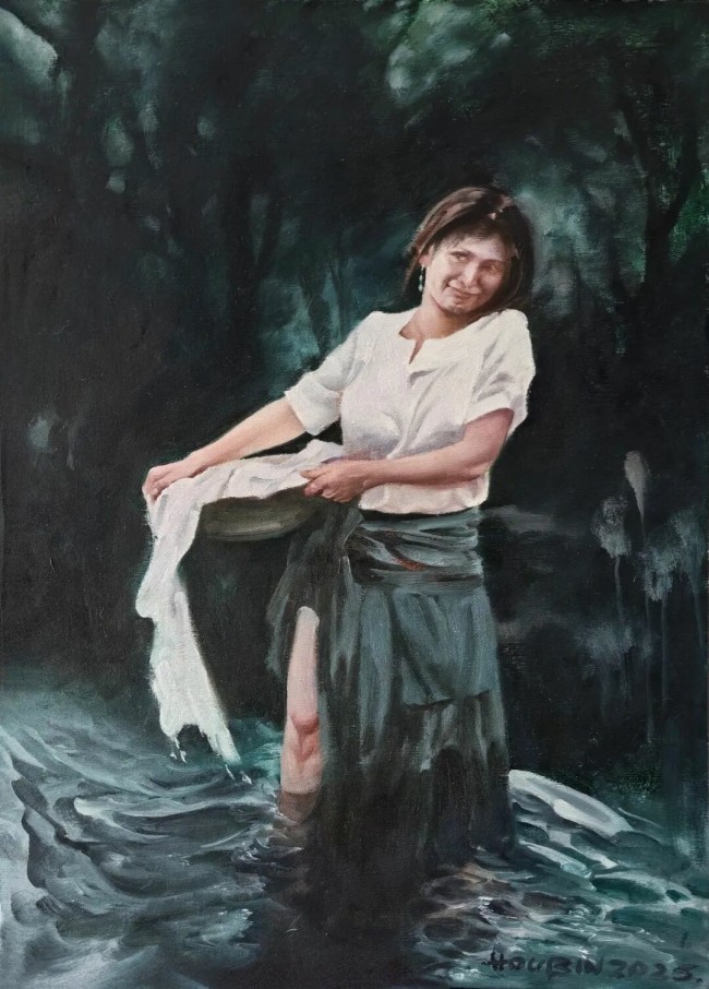 侯滨的笔法灵活多变,既有描绘面部五官与神情时的细致精微,体现出古典写实传统的深厚底蕴;也有在服饰、背景或光影渲染处的大胆写意与率性挥洒,流露出东方绘画美学中“书写性”的意趣。这种处理方式,使得画面在严谨的造型中不失生动气韵,在自由的表达里仍见结构法度。笔触的痕迹被有意保留,形成丰富而耐看的肌理效果:有时如薄纱轻覆,朦胧透亮;有时如泥土层叠,厚重朴拙;有时则如风行水面,留下涟漪般的微妙痕迹。这些肌理不仅仅是塑造形体的手段,它们本身就成为画面叙事的一部分,记录着创作过程中艺术家的呼吸、心跳与瞬间的情绪律动,赋予静止的图像以时间流动的质感与生命温度。