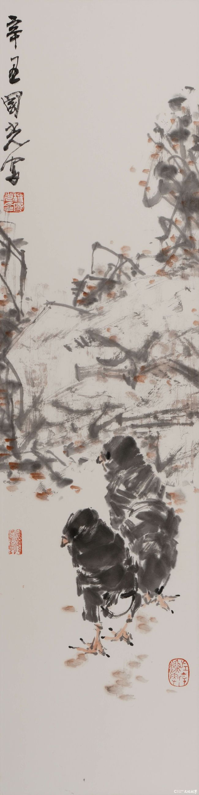先生重写生,以速写入画,这即是师承梁黄胄的路子,也兼有他重观察写实,将生动的形象与笔墨语言,以及娴熟的技巧相结合,追求有笔有星,不与人同,以望九高龄而迈入海内丹青大师之列。先生的画重写法,流畅而兼有笔情墨趣,如小鸡画法有别于白石、黄胄、任伯年之技法,在前贤大师名作面前,即有吸收,又别开生面,自树一帜,饮誉画坛,是当今笔墨造型自白石,黄胄,任作年之后而近乎完美之阶段,先生的画墨法独特,讲完用笔,而风格寄奔放高格为一体,讲究意境、品位,出笔在性情奔放中而有沉厚的美学品格。先生的小鸡、鸽子,笔墨之美可放当代大家而毫无逊色。在前贤大师名作面前,即有吸收传统余绪,又别开生面、自树一帜、饮誉画坛,是当今画坛又一高峰。