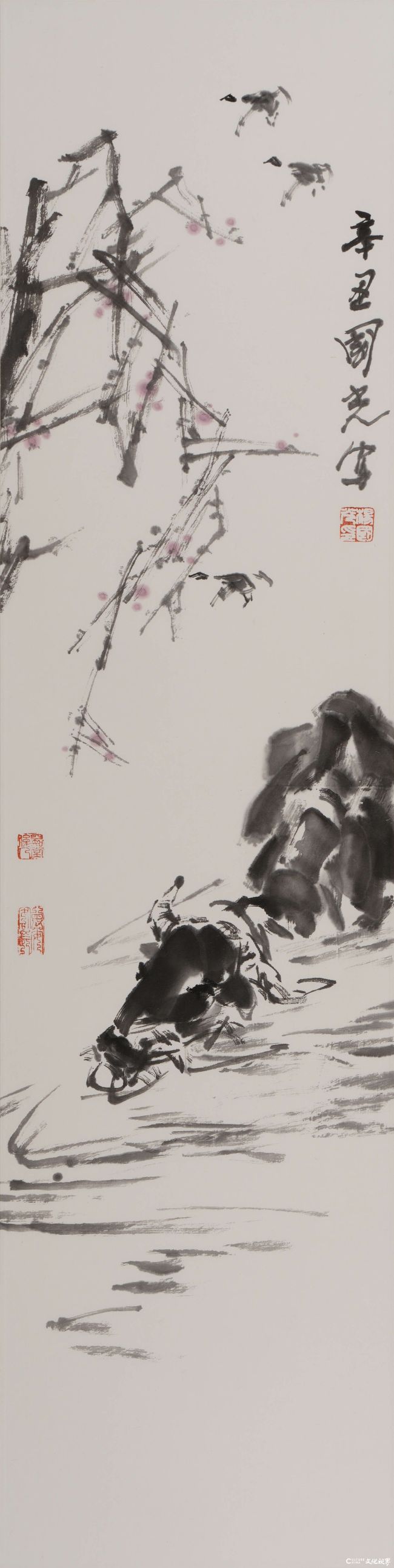 关于杨老师的花鸟艺术,我谈两点感受。一、杨老师的花鸟艺术,注重笔墨和写实造型的高度融合,展现出严谨的学院气质。细一想,杨老师的写实造型不同于一般意义上的素描造型,素描造型讲究明暗变化,很显然,杨老师的笔墨造型是基于写实造型的一种抽象和提炼,似乎更偏向于中国传统画论中叫“造理”一说。北宋有个叫张怀的说:“绘画造乎理者,能尽物之理也。”苏轼评吴道子的画:“出新意于法度之中,寄妙理于豪放之外”。杨老师的笔墨造型法度谨严,一笔一画毫不含糊。这里所讲的“法度”,当然来自杨老师对自然万物的深入观察,来自杨老师本人深厚的素描功力,但杨老师笔下的花鸟并不完全是生活化的,他画中的牛显得尤为特殊。如果说一般的造型注重视觉的表现,那么,杨老师笔下的牛,画出了他自己心中的样子。牛的造型及其意象,看上去既自在、又虚静。有一句话是这么说的:唯有内心虚静,才有道的位置”。不论“缘情体物”,还是“缘理体物”,杨老师的花鸟形象有情有理,总体来看,理大于情。这里的“理”某种意义上更接近“道”,有点宗炳所讲的“圣人含道映物”的意思,说明“新意”和“妙理”出自于主客不分、物我合一的主体审美状态,这也就是杨老师的笔墨造型基于写实又超越了写实,既充满生命能量又高度形式化的缘由所在,从而体现了融合中西、笔到意到的结构美感和趋向于“理”的表现力。