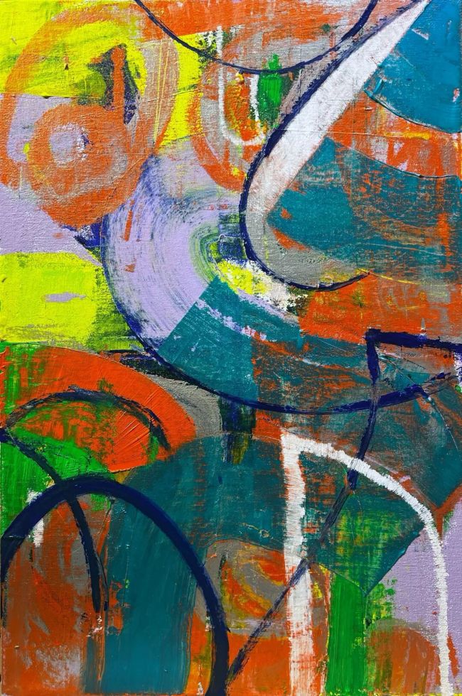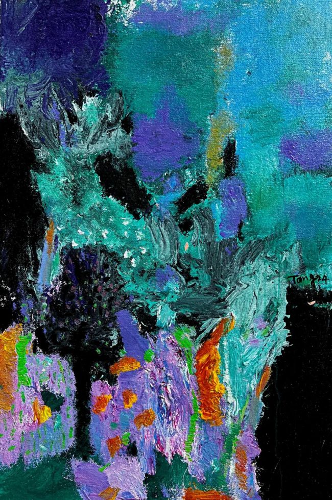 每每遇到他在创作时,总能感到那种迎面而来的激情。你会看到一个艺术家如何掌控全局。画布是他的指挥台,画笔与刮刀是他的指挥棒。他时而快速时而果断的手势,让色彩在画布上“发声”。明亮的蓝与绿如同木管乐器的清澈,深沉的黑与褐像是低音器的厚重,而跳跃的黄与红则仿佛铜管的嘹亮。他并非机械地安排色彩,而是通过“有效失控”的方式,让颜料在碰撞、流淌、叠加中产生自然的和声。