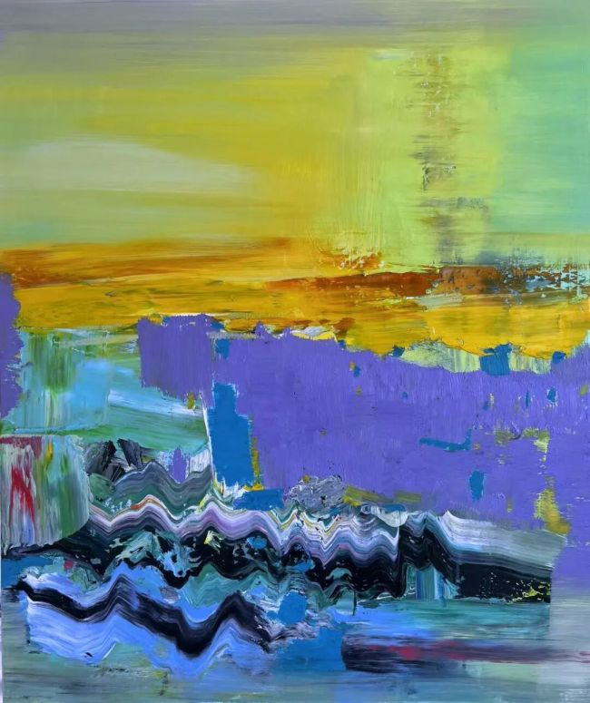 时间的折叠则赋予作品流动的生命质感。唐承华将四季流转、潮汐涨落的时间轨迹,凝固为画面中交错的色彩与笔触,让瞬间与永恒在抽象形式中达成和解。“潮汐”系列里,柔和的粉蓝与跳跃的柠檬黄碰撞交织,既捕捉了日出时海面的金光闪烁,也沉淀了暮色中潮汐退去的静谧,一日之内的光影变幻被折叠为静态的视觉韵律。他从北京近郊到新疆雪原的采风足迹,化作画布上层层叠加的创作痕迹,将不同时段的自然感悟折叠为跨越时空的精神印记,让“岁月的不朽与匆促”在色彩的碰撞中显现。那些重复的笔触、叠加的色块,如同时间的年轮,记录着自然的循环与生命的迭代,使作品成为“时间的艺术”,在静态中蕴藏着永恒流动的韵律。