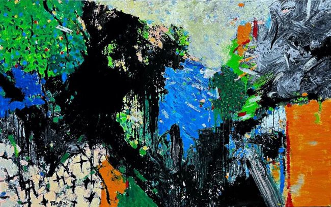 自然是唐承华的创作核心,而宇宙观则是其艺术的精神内核。他以“有效失控”的创作状态,让自然的原始力量在画布上自由释放,色彩的交融碰撞恰似宇宙诞生之初的能量涌动,色块的浓淡变化则暗合天体运行的节律。东方水墨的黑色灵魂与西方抽象的色彩张力相融,构建起跨越文化边界的宇宙图景——黑色构架如宇宙的暗物质,支撑起斑斓的色彩星云,点线的穿插如同星辰的轨迹,在时空褶皱中编织出万物共生的秩序。这种创作既源于他对自然的敬畏与顺应,让“山高任山高,水长任水长”的生命态度渗透画面,又通过理念抽象的探索,将自然物象升华为宇宙规律的视觉表达,使每一幅作品都成为“无状之物的过渡”,连接着具象自然与抽象宇宙。