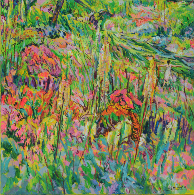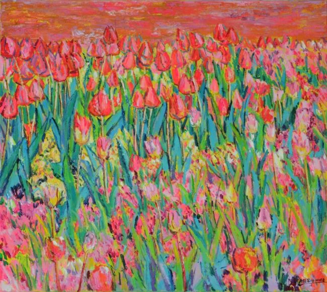 我发现张富坤的笔触,大胆泼辣,每一抹色彩都似从灵魂深处迸发而出的呐喊,浓烈得几乎要灼痛人的眼睛。他笔下的花,无论生于林野还是市井,都饱含一种不可遏制的生命意志,如尼采所颂扬的“权力意志”的具象呈现。那厚涂的玫瑰色花瓣,如火焰般在画布上燃烧,烧灼着观者的心——生命的力量,不正是如此在沉默中积蓄,于爆发时灼灼燃烧的吗?