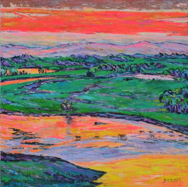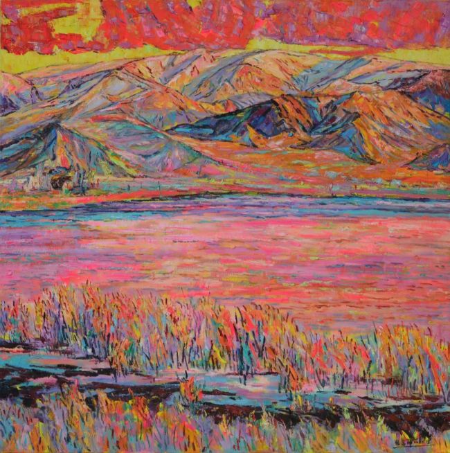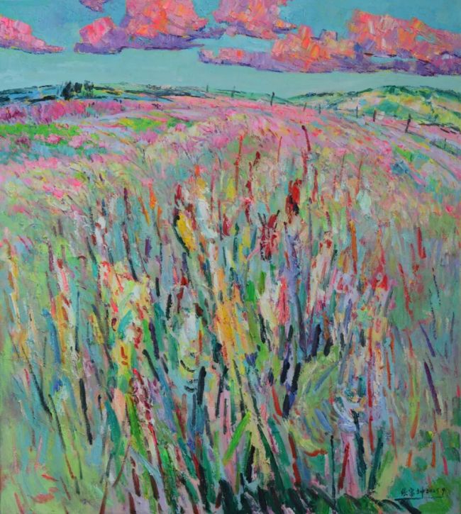 张富坤的油画世界,如大自然之魂魄在画布上纵情奔涌。他笔下的晚霞,每一道光芒皆被赋予了生命的炽热,朱砂与青莲在画布上角力、融合,像天穹之中正进行一场壮丽而无声的争斗。而那海边晚照下归帆,却被晚霞温情地拥抱于怀中。船帆被映照得如同燃烧的火焰,又似被霞光温柔浸透的纸片,漂浮在波光粼粼的海面之上。这些帆影被霞光染透,恰如漂泊者最终接纳了自然慷慨的馈赠,成为人间烟火与天地壮阔之间,一座深情而温暖的桥梁。