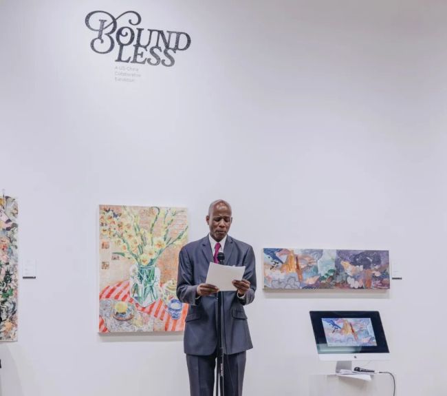 展览现场,中国驻美大使馆负责文化和旅游事务的陈春梅公参,艾比林基督大学副教务长、副校长韦斯·克劳福德博士,该校人文艺术学院院长瑞秋·米利根博博士,艾比林市文化事务委员会主任林恩·巴内特,中方艺术家代表高云、翟优、樊蕾,美方艺术家罗伯特·格林、邦尼·莱博维茨、肯尼·琼斯、波莉·琼斯、霍利·布朗,以及美国著名诗人、教授史蒂文·摩尔博士等中美艺术界人士与地方各界代表100余人齐聚一堂,共赴这场跨越山海的艺术之约。活动由艾比林基督大学艺术与设计系主任、美方策展人罗伯特·格林教授主持。